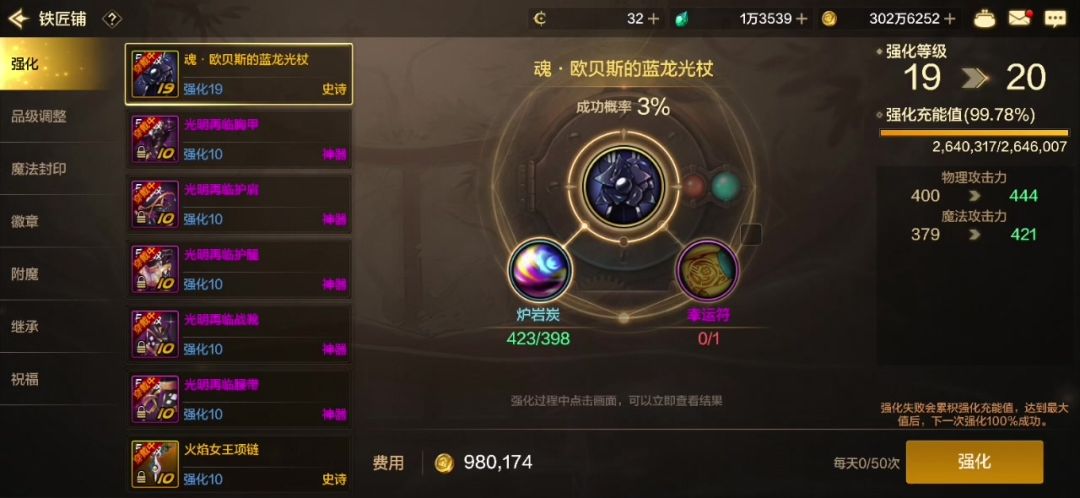 很多宝子们目前对于强化有点拿捏不准,想要把自己的装备再往上打造打造,确不知道要多少才是个头,今天糯米就给宝子们详细列举一下强化20所需要的成本! 以50级的史诗强化为例、目前糯米所在的区服炉岩碳的价格150泰拉+幸运符2w泰拉为例,+12开始需要使用幸运符,以每一次强化都保底来计算的话,具体成本如下:武器强化13→14,显示成功概率为7%,按照概率来算平均保底15手,能够成功。所需要炉岩15*