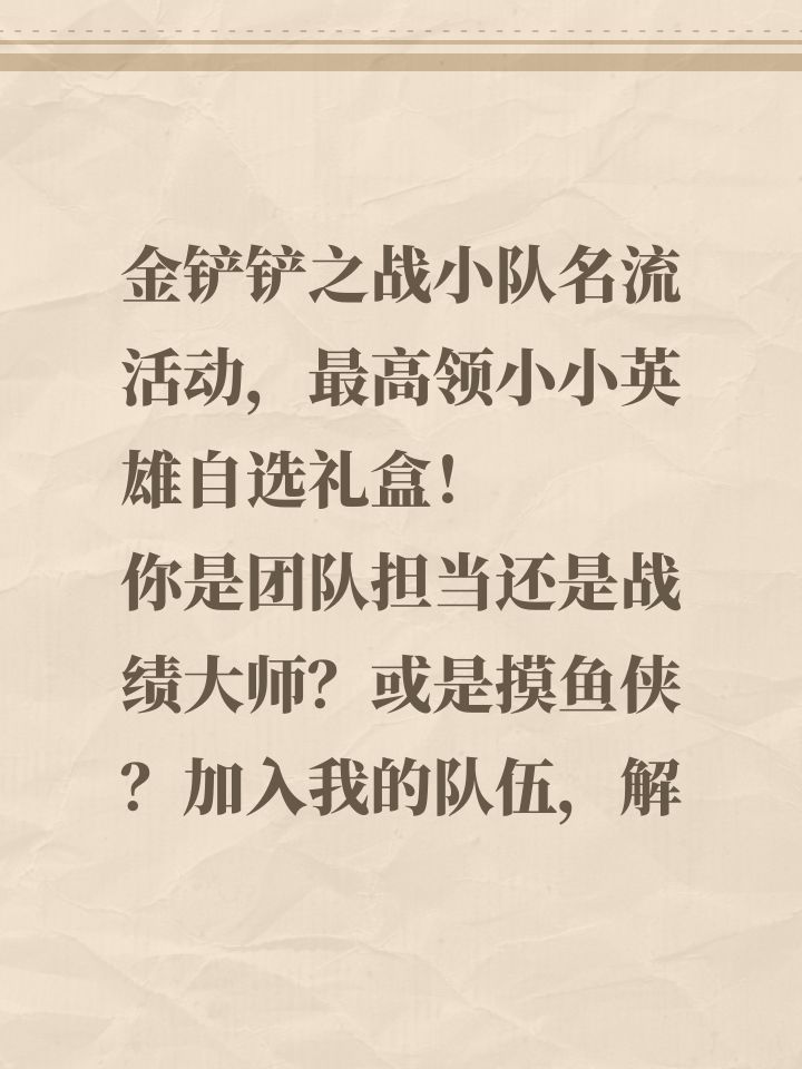 #归龙潮 #归龙潮公测打卡 #归龙潮抽卡进度 金铲铲之战小队名流活动,最高领小小英雄自选礼盒!你是团队担当还是战绩大师?或是摸鱼侠?加入我的队伍,解锁“铲格”。【入队密码:小队名流xmVV9DYKnv】