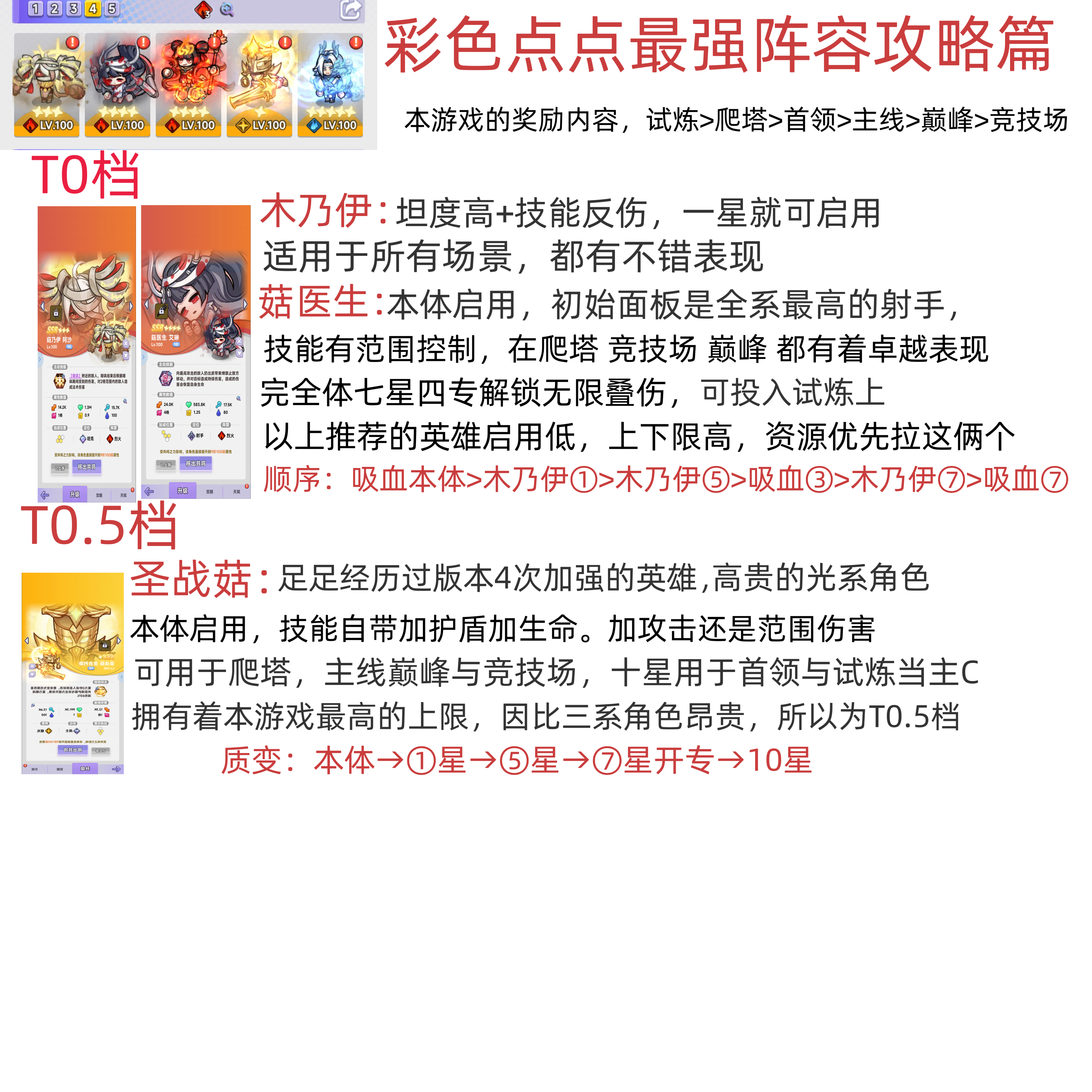 完美解答了这游戏的版本答案,本人拥有265小时的游戏时间,玩了半年以上,对这游戏的理解绝对可以,新人直接按照这图的顺序养角色就行,后续两个角色我会继续更新,写在下面#彩色点点战争 #彩色点点战争垃圾游戏
