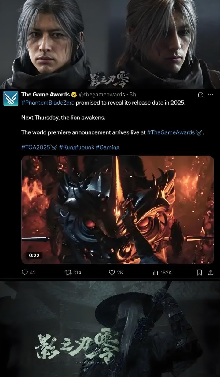 终于要来了!等了这么久的国产动作游戏《影之刃零》,官方官宣要在TGA上定档!TGA官方推特发消息了,灵游坊做的“武侠朋克”风的《影之刃零》,会在12月12号的TGA颁奖礼直播上,直接告诉大家具体哪天发售。 官方还搞了个23秒的预热视频,游戏官网主页也挂上了“发售日期 即将揭晓”的字。 这游戏是用虚幻5做的,画面差不了,风格是传统武侠混搭蒸汽朋克,动作部分是甄家班指导的,之前IGN都评价
