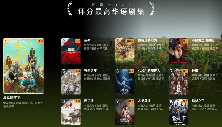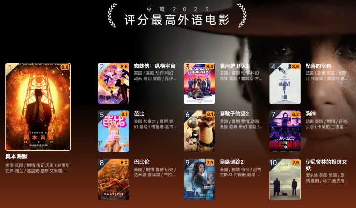 其他榜单也一并公布:评分最高华语电影:《流浪地球2》评分最高华语剧集:《漫长的季节》评分最高外语电影:《奥本海默》#动画#电影#影视