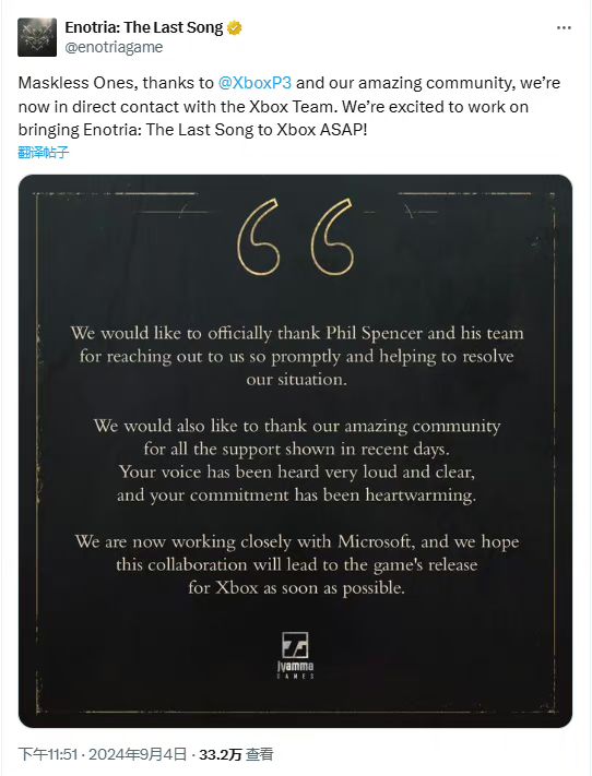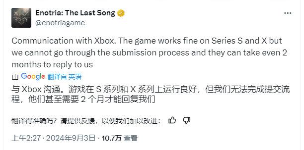 9/3号,《艾诺提亚:失落之歌》宣布,游戏的Xbox版将无限期推迟❗❗❗ 延期的原因是,微软Xbox方面的缺乏沟通,2个月才会回复事情闹大后,微软已就此事向《失落之歌》开发商致歉9/4号,《失落之歌》开发商发布新公告,表示正在与微软密切合作,将尽快在Xbox上发布游戏