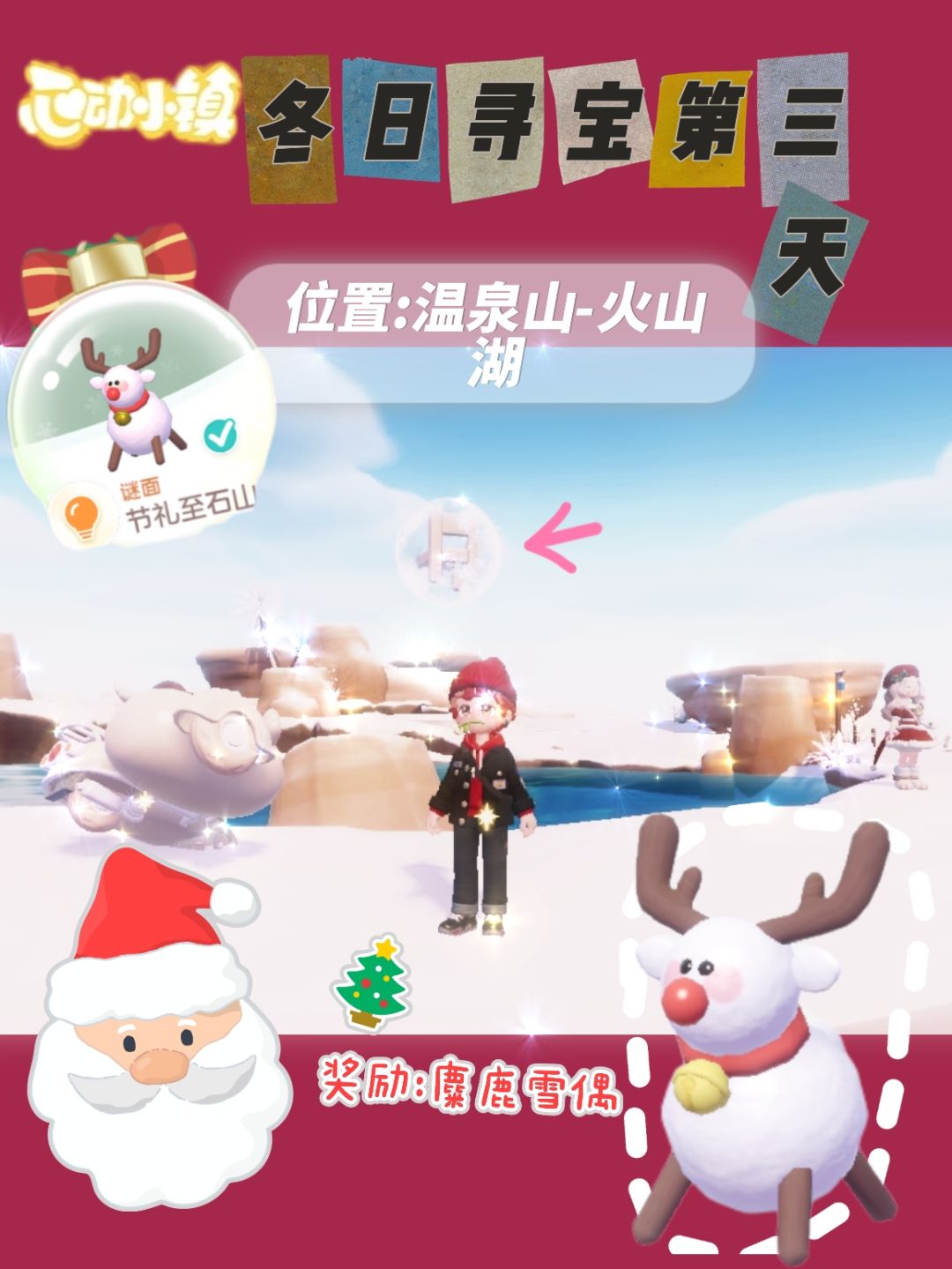 #心动小镇线条小狗联名 找之前记得点一下活动迷面,这样才能显示泡泡✨ 谜面:节礼至有山 位置:温泉山湖-火山湖,中间最大的湖周围 奖励:麋鹿雪偶#心动小镇 #心动小镇创作计划 #心动小镇冬日寻宝 #心动小镇泡泡