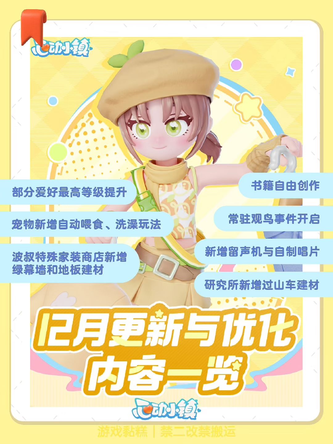 1️⃣书籍自由创作 2️⃣研究所新增过山车建材 3️⃣新增留声机与自制唱片 4️⃣部分爱好最高等级提升 常驻观鸟事件开启 5️⃣宠物新增自动喂食、洗澡玩法 6️⃣摄影玩法优化 7️⃣小镇居民换冬装、更会聊天 #心动小镇 #心动小镇创作计划 #心动小镇创想团 #心动小镇大更新