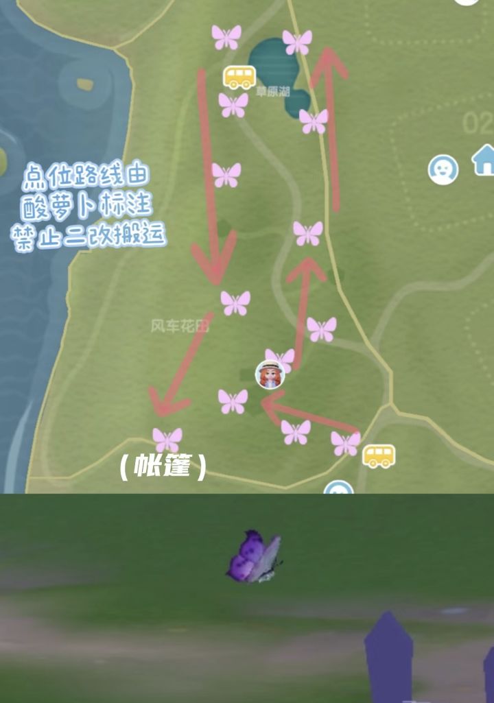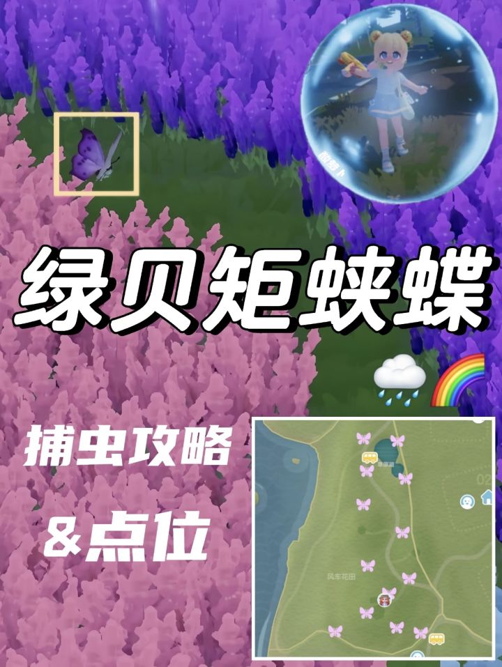 爱好9⃣️ 级解锁时间段:0-12点出没天气:雨天🌧️/彩虹🌈获取途径:花田-风车花田主要出没位置:p3点位 补充:①注意天气和时间段,0-12点的雨天或彩虹天才有;②建议开【低画质】,蝴蝶颜色为浅粉,隐藏草坪后非常容易看到;③靠近会飞远,贴脸多次惊吓会消失,要用【蓄力法】,主页有视频讲过蓄力法可以参考,注意地形;④一次刷一只,刷新较快,不要遗漏帐篷处;⑤p3点位仅供参考,可