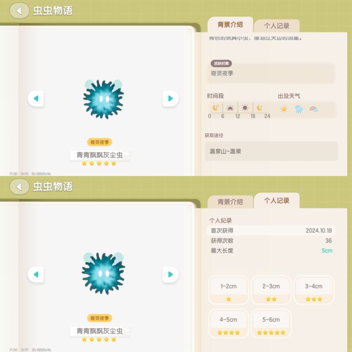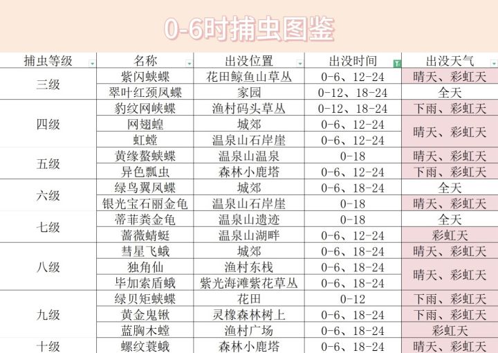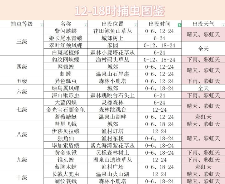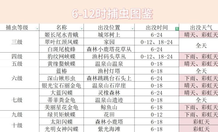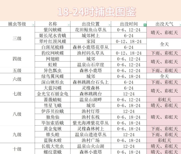 时间:12点-24点 天气:晴天/彩虹 位置:森林跳跳台,常见于跳跳台两个入口处附近,靠近海的那一边的树干上,最远刷新位置在巨木河的大树上见到过,猜测每次最多刷新两只。 #心动小镇捕虫攻略