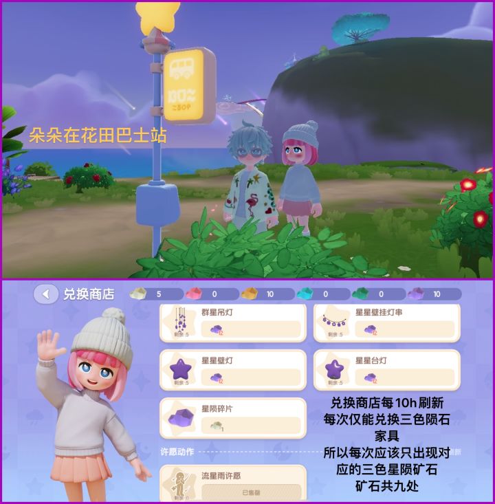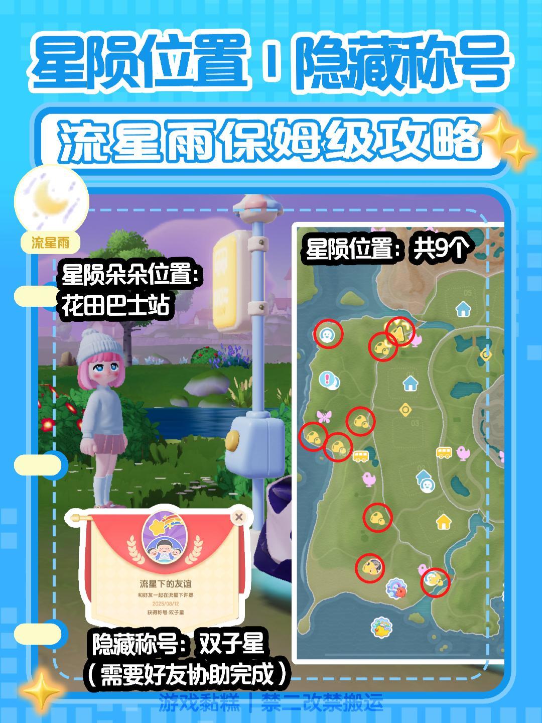 1️⃣朵朵位置:花田巴士站 2️⃣星陨位置:一共9个(数量的多少随机的) 3️⃣隐藏称号(两个方法) (1)和好友做5级的双人动作 (2)和好友购买流星许愿动作(星陨朵朵商店购买),购买之后一起做动作 以上两种办法都能获得隐藏称号和成就 #小马宝莉心动小镇周年联动 #心动小镇 #心动小镇创作计划 #心动小镇创想团 #流星雨天气陨石采集心动小镇 #心动小镇攻略 #心动小镇攻略征集 #心动小镇日常 #