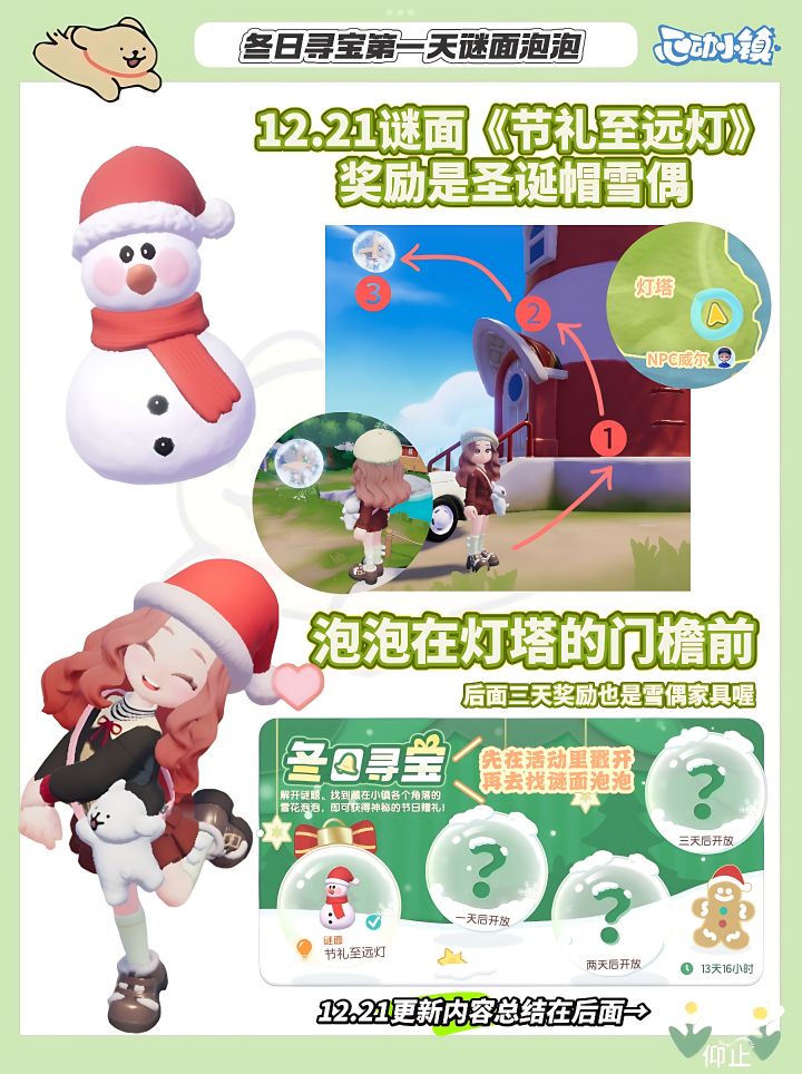 冬日寻宝第一天谜面泡泡《节礼至远灯》谜面:威尔打开窗,就能看见这份节日的礼物泡泡:灯塔的门檐正前方上空漂浮奖励:圣诞帽雪偶〔家具·装饰〕技巧:①踩台阶;②大跳到门檐上对准往下跳—————————— ㋋ ฅ՞• •՞ฅ ㏴ —————————🎁 12.21更新内容总结 🎁🕰️ 2024年12月21日06:00至2025年1月4日05:591️⃣ 上线就送家具“圣诞树”🎄登录后在邮箱领