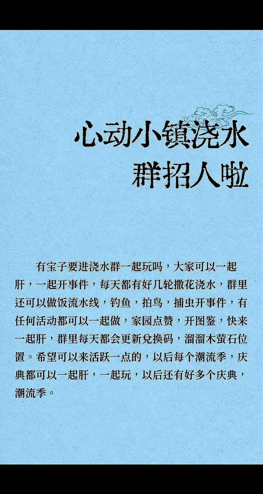 有宝子要进浇水群一起玩吗,大家可以一起肝,一起开事件,每天都有好几轮撒花浇水,群里还可以做饭流水线,钓鱼,拍鸟,捕虫轮流开事件,有任何活动都可以一起做,家园点赞,开图鉴,快来一起肝,群里每天都会更新兑换码,溜溜木萤石位置。希望可以来活跃一点的,以后每个潮流季,庆典都可以一起肝,一起玩#小镇心动瞬间 #心动小镇 #心动小镇兑换码 #心动小镇公测 #心动小镇创作家激励计划 #心动小镇创作计划 #心动小