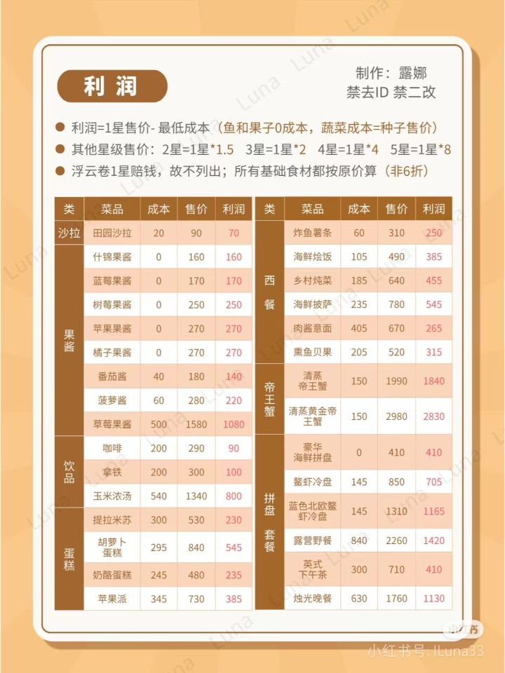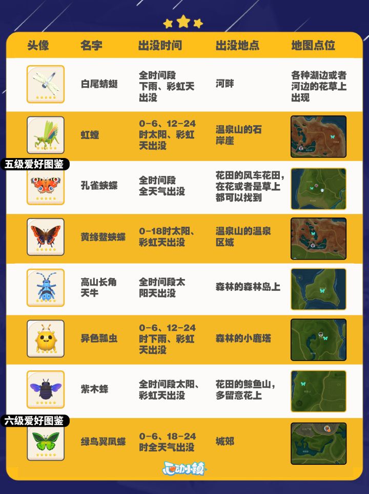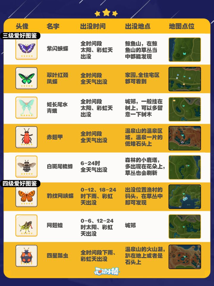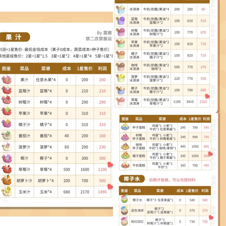 全是网络搜集(图片上有各个作者名字),换成桃朵朵的有花各种星级的价格,加个1-10级鱼分类区域时间。。还有个偶尔做抓虫委托任务的1-6级虫,自己方便找,合集备份个帖子#心动小镇 #心动小镇攻略征集 #心动小镇攻略 #心动小镇园艺 #杂交 #小心动小镇创作家激励计划 #心动小镇烹饪 #心动小镇潮流季 #心动小镇赚钱