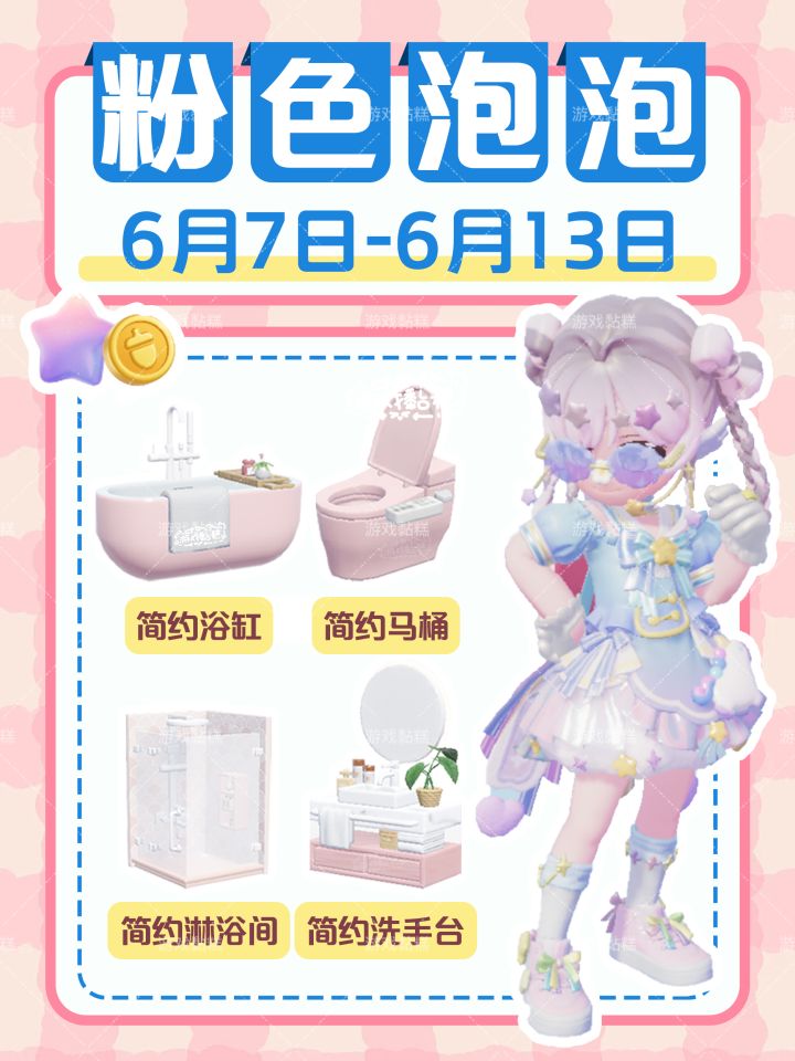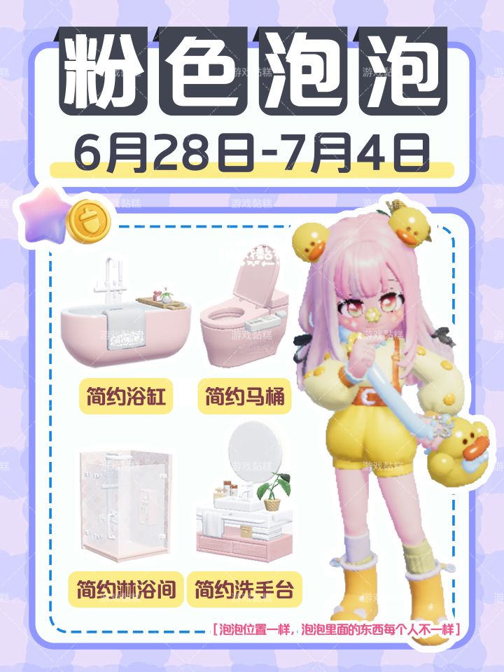 时间:5月31日—6月6日粉色简约卫浴家具获取:简约浴缸、简约淋浴间、简约马桶、粉色简约洗手台⚠️家具数量随机的!⚠️只是位置一样!泡泡里面的东西是随机的!!#小镇庆典稚趣园 #心动小镇 #小镇稚趣园攻略征集 #心动小镇创作计划 #心动小镇创想团 #今天游戏圈发生了啥 #心动小镇家具泡泡 #心动小镇每周泡泡 #心动小镇粉色泡泡 #心动小镇粉红泡泡点位
