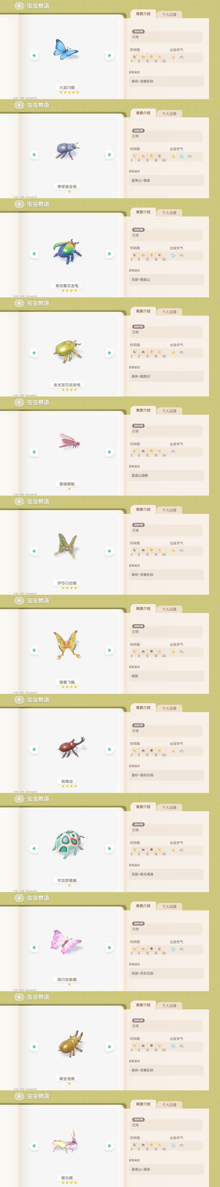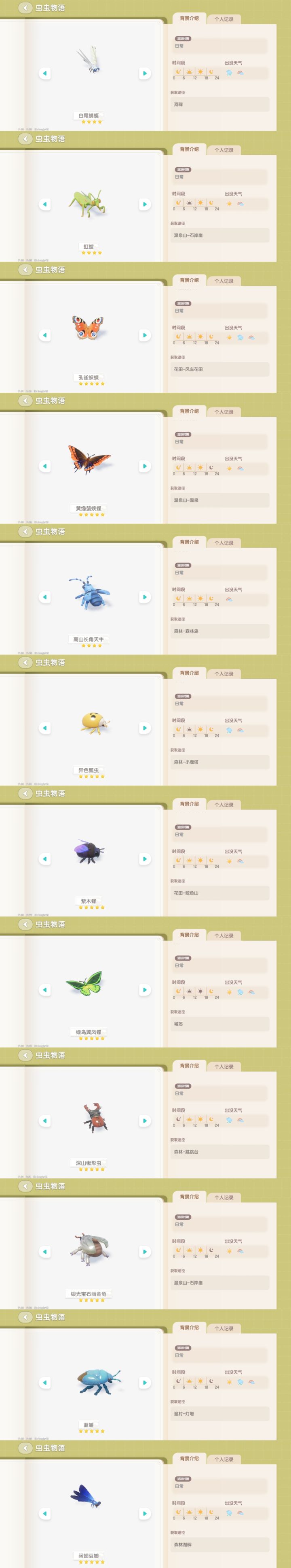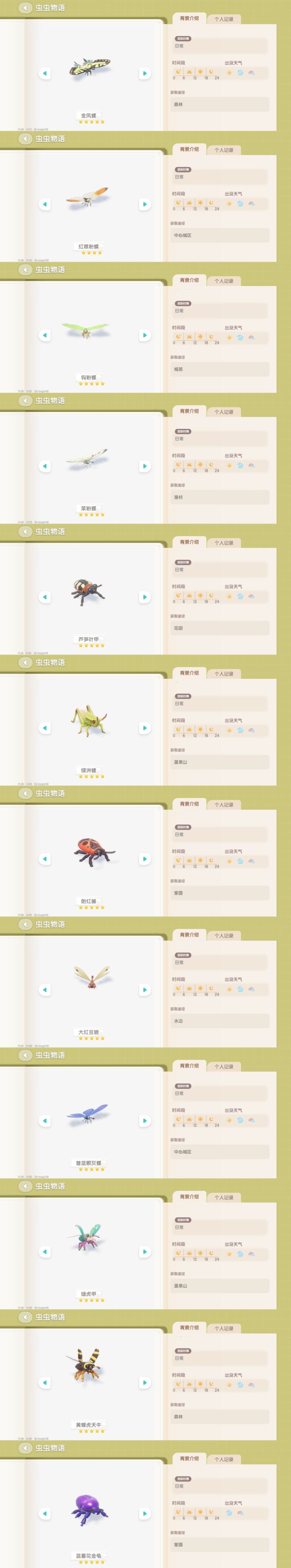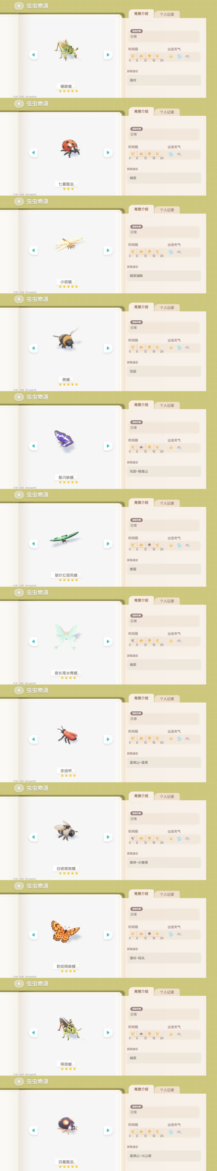 这里是所以虫子的图鉴截图全部是我自己开的,都是对的需要的点赞收藏以后用#心动小镇 #心动小镇虫子攻略