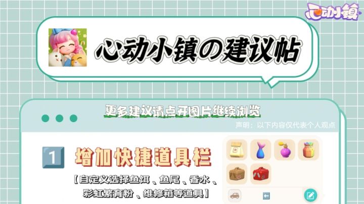 🎮玩心动小镇有三个多月了希望小镇越来越好📝发长帖提一些建议希望官方可以酌情采纳🪧首次声明:以下内容仅代表个人观点💡📃给心动小镇的亿点点建议如下:1️⃣增加快捷道具栏 🧰 🛠️✿工具栏增加第二页为道具栏,玩家可自定义选择添加鱼饵🐟、美人鱼诱捕器🧜🏻♀️、美人鱼香水🧜🏻♂️、彩虹繁育粉🌈、维修盒🧰、彩虹花束💐、肥料、生长素等道具到快捷道具栏。☑每次使用时不用