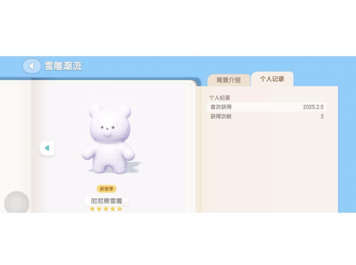 2.5凌晨雪天,攒了74颗雪球开整,没撒花出的五星尼尼熊养猫,后来撒了花出了两个新的五星害羞;也有重复的五星,雪糕筒你给我整这么多五星干嘛,做鲷鱼烧雪雕摊吗汗汗汗但是出尼尼熊雪雕的概率还是很低,74颗雪球只出了5个,还有个四星没出难过;又要慢慢攒雪球了,还有三个雪雕没五星石化
