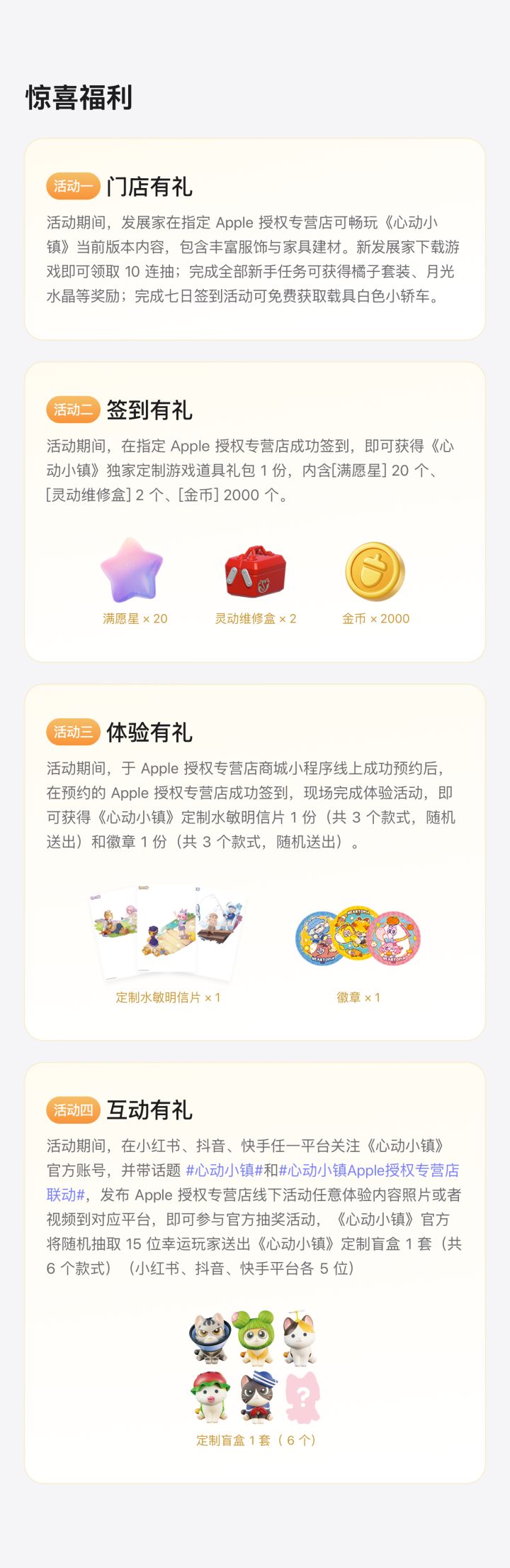 在小程序🔍 Apple 授权专营店小程序找到周边的授权店进行预约就可以了活动时间是1月31日-2月13日一共3个款式授权店员小哥很好说话呀吧唧和明信片都很好看!#心动小镇 #心动小镇创作计划 #小镇心动瞬间 #心动小镇新春季 #心动小镇线下活动 #心动小镇apple授权专营店联动