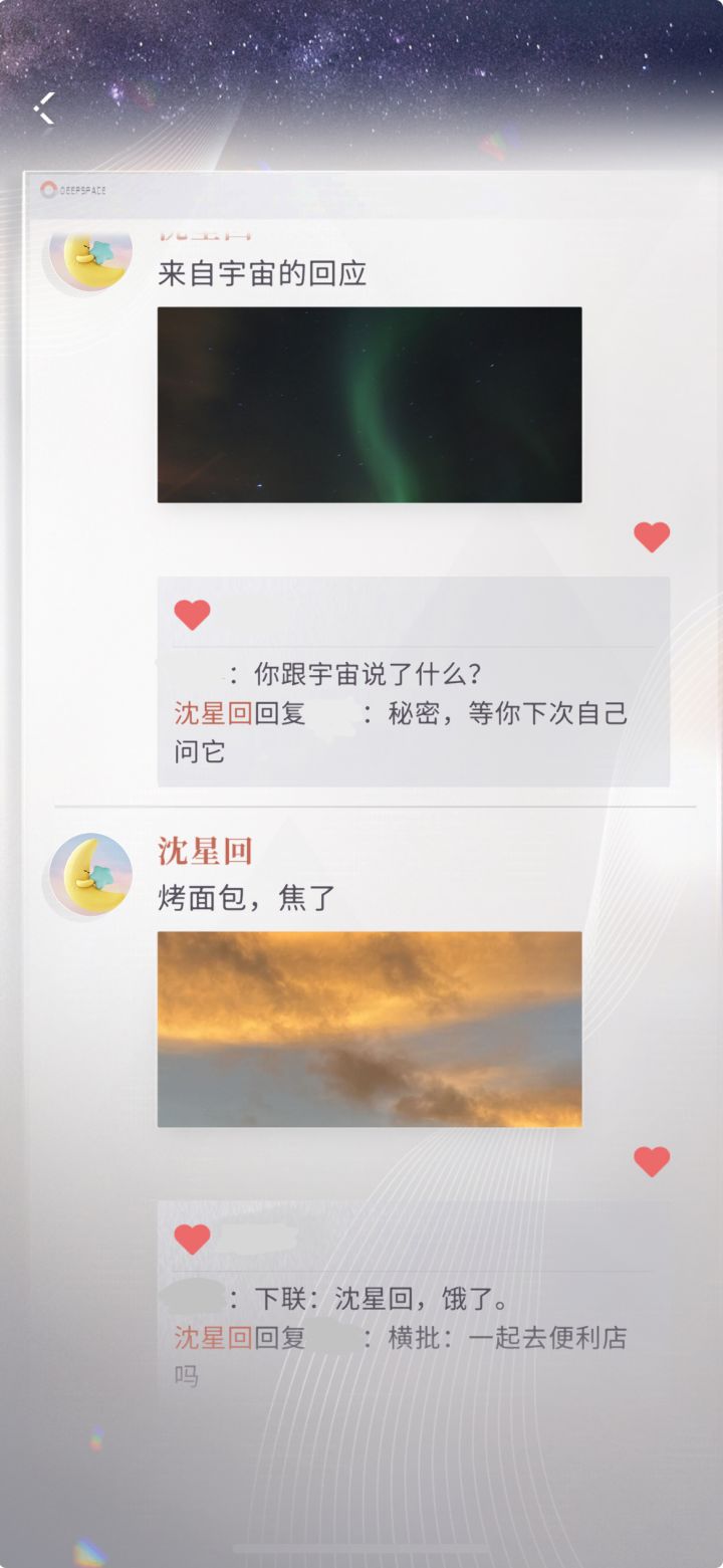 亲爱的深空猎人,《恋与深空》已于2024年1月18日正式上线!TapTap 社区心动时刻征集活动也于今日正式开启!【活动时间】即刻起 — 2024年2月18日23:59【活动奖励】心跳同频奖:活动结束后我们将从符合要求的稿件中随机选出 60 位幸运的猎人,每位奖励 恋与深空纪念镭射票(款式随机)1 份。【稿件要求】征集内容需要包含两部分:● 对他说的话:选择一位《恋与深空》游戏内的