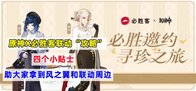 原神和必胜客的新一波联动已经开启。想必不少小伙伴都想趁这次联动入手限定款风之翼,以及精致的联动周边。经过这几天的观察总结,以及亲身体验后,接下来就由我来给大家总结四个小贴士,让大家能更顺利地“攻略”本次联动活动。一、记住几个时间点,以防错过联动联动正式开启的时间是不久前的4月3日,如果是之前就已经预约成功的小伙伴,直接在对应的时间点,根据你之前预约的方式到店或者选择外带/外送服务即可。如果是还