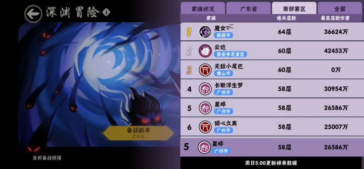 家族招人,稳定58+,这周buff有些差没有过59,人员还有大量空缺,欢迎大佬加入星晔。有兴趣的,欢迎搜索家族编号 475729 星晔 主深渊稳58+ 全国50左右,可带银头深渊赛季结束可以拿框框,家族每周有红包可以抢,每月抽神龙 和战令(深渊输出三千万以上可参与,一个月达标2次即可)每周家族群大量SS+,车车,不定期抽忍三周边有意者 可以