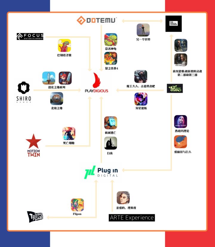 这个图只讲移动端游戏这块,不然会更加复杂,像focus发行过playdigious的ns游戏,死亡细胞制作组援助过灾厄逆刃是数码插件发行的等等。法国单机移植手游的源头大概要从dotemu开始,dotemu是一家专注于复古游戏的厂商,做了大量的复古游戏移植工作,如法国传奇游戏另一个世界20周年版(最早使用电影化叙事的游戏),不过该游戏steam端由digital lounge发行,移动端倒是自己发