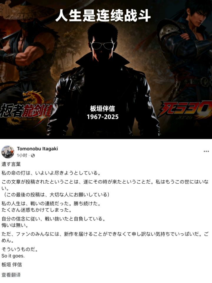 墨镜侠谢幕,硬核永存!《忍龙》之父板垣伴信逝世,享年58岁“🔔人生是连续战斗”——这句刻在无数玩家记忆里的宣言,终究迎来了休止符。✅️2025年10月16日,被誉为“忍者龙剑传之父”“死或生之父”的传奇游戏制作人板垣伴信,因病与世长辞,享年58岁。✅️这一消息由其生前好友、Team NINJA前同事早矢仕洋介率先确认,瞬间在社区掀起悼念热潮,那个常年戴着墨镜、身披皮衣的“硫酸脸”大叔,终究带