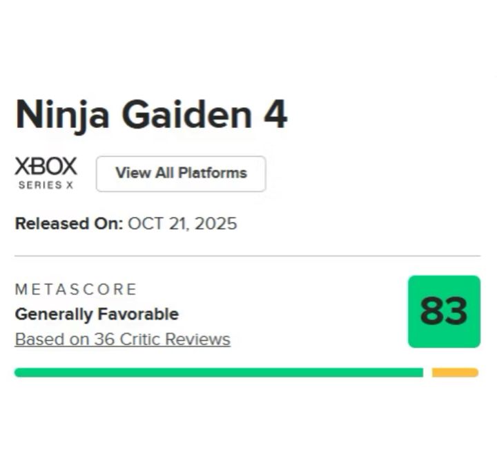于2025年10月21日发售的《忍者龙剑传4》在Metacritic取得低至中80分区间的平均分,基于三十余家媒体评测,多数平台版本分数介于81至83分。这一成绩远高于近期系列作品:《忍者龙剑传3》(58分)与《剑勇传奇:忍者龙剑传Z》(43分)均因偏离系列核心特质遭遇口碑滑铁卢。 即便2021年收录多部重制版的《忍者龙剑传:大师合集》也仅获73分,更凸显新作的成功。现代《忍者龙剑传》系列