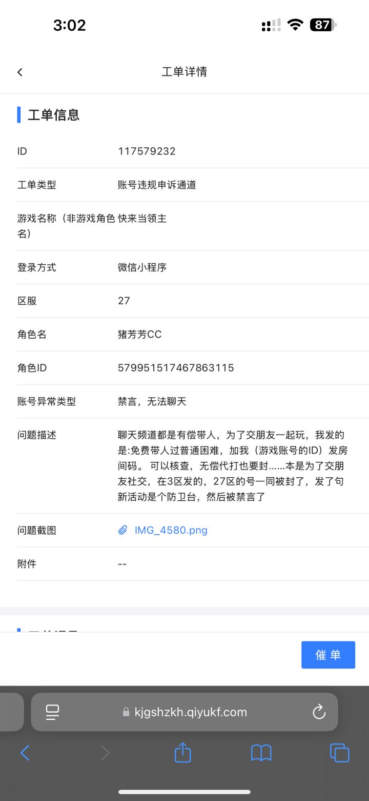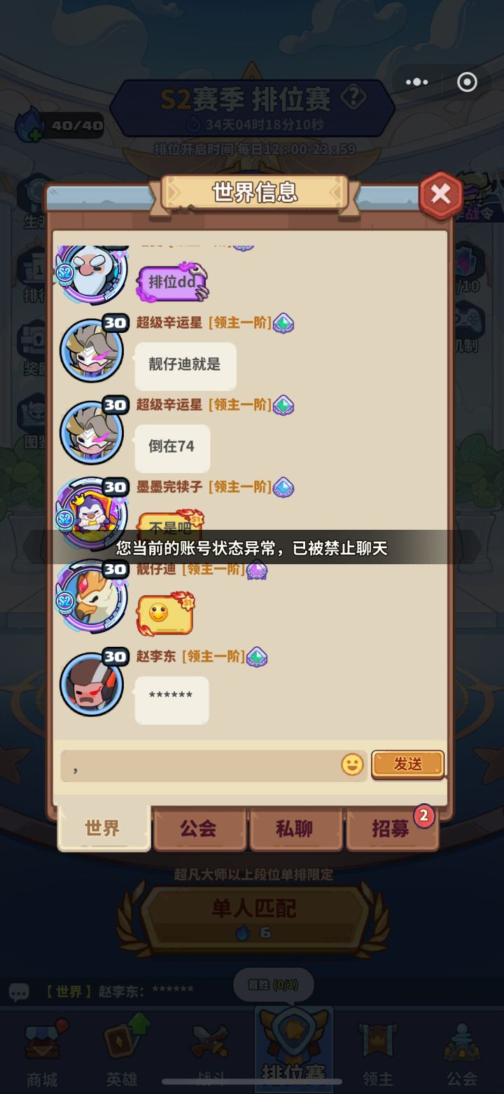 因为世界聊天和抖音主播,都是有偿带普通困难的,为了交朋友,玩游戏也热闹,发的:免费带困难,私我发房间码,!可以说有偿代打禁言我,免费带新手玩游戏也要被封吗,然后大号被禁言了,一直不知道怎么回事,就申诉,申诉无用,查一查我最近发的是什么,怎么判定禁言的,近期发现可能因为打广告被禁,望官方公正一点吧,真心热爱这游戏,别的游戏禁言都是有提示或者警告 #快来当领主 #快来当领主快来 #快来当领主官方 #快