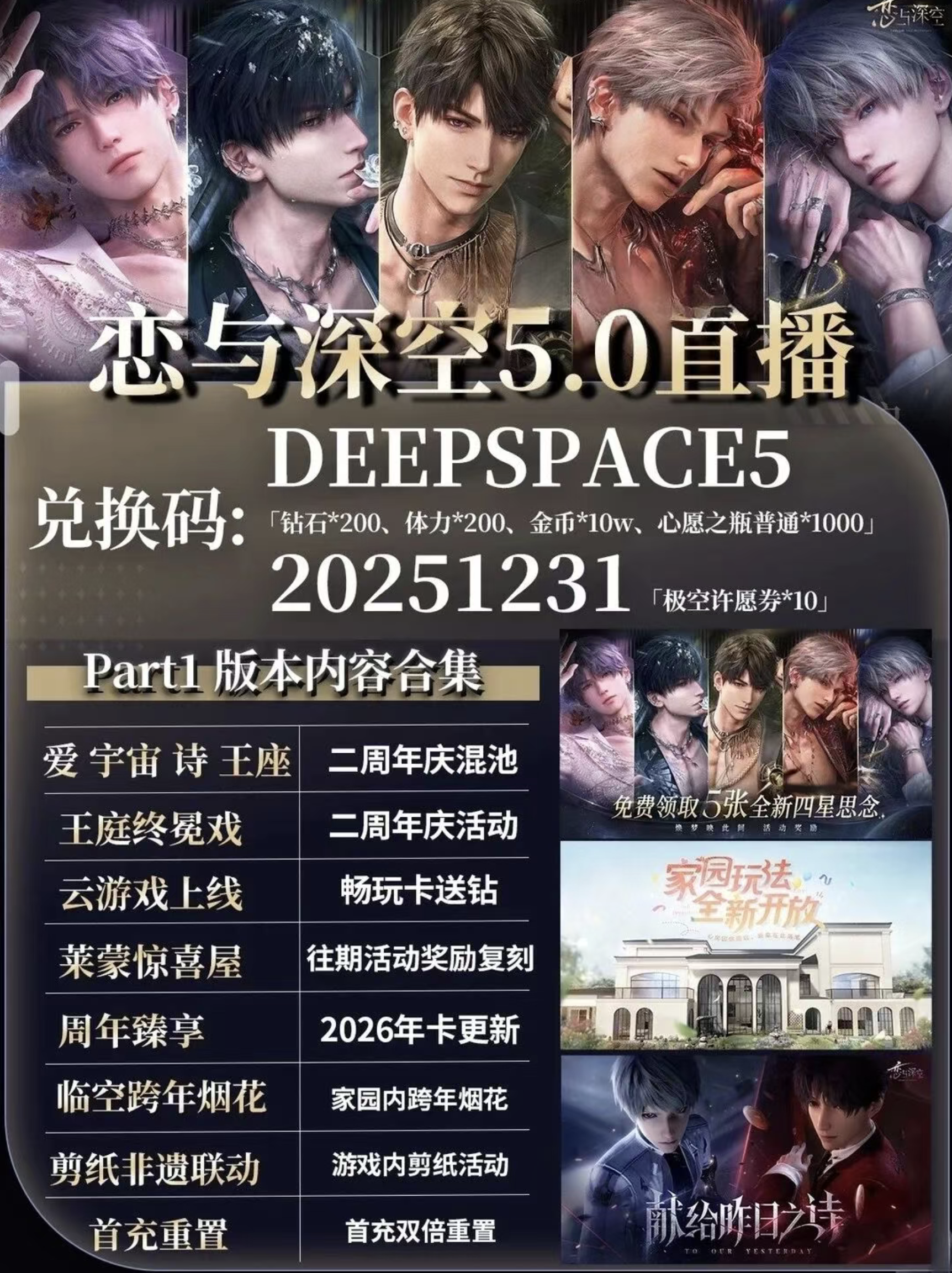 《恋与深空》昨日前瞻直播,将于12月31日开启5.0版本“二周年盛典”。同时新版本将推出全新系列五星思念混池,并免费赠送五张四星思念,还可免费自选一张常驻五星,主线也会更新,并上线猎人小姐们期待的3D互动家园系统,登录即领花园独栋别墅一套!家园玩法还将解锁8000+钻石(如图二,图三)。还有两个兑换码,DEEPSPACE5,20251231,可领取十连抽、钻石等奖励,有效期至2026年1月20日