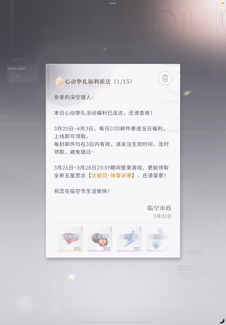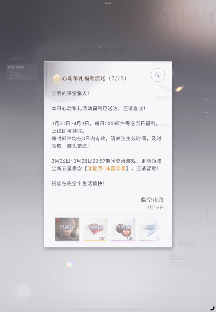 第一天的快结束了,没有上线领取的记得上线看看 #恋与深空 #恋与深空踏春季 #游戏种草计划