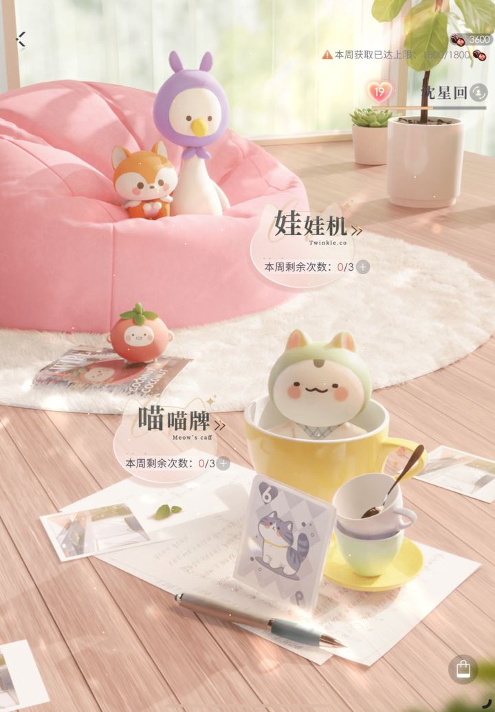 如果觉得打喵喵牌和抓娃娃啊,太麻烦的话,可以进去后直接退出来,虽然每次只有75的快乐巧克力你认真的话单个人也不过就2x3x150,而且每个人都拿全会超出周上限但是!!!一个人喵喵牌是3x75,抓娃娃是3x75,总共是450三个人总共可以拿1350,而且10分钟不到!如果觉得麻烦的夫人们可以试试,就是抓不到娃娃而已,而且喵喵牌的喵币照拿!如果想拿全!不嫌麻烦就每个男主都认真地