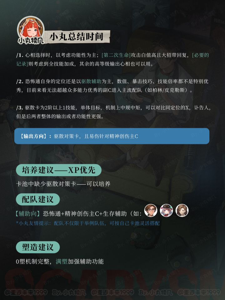 重返未来1999『恐怖通』养成攻略各位司辰们好呀,本期小丸给大家带来【重返未来1999】的角色培养攻略啦~角色:恐怖通 Horropedia星级:❇️❇️❇️❇️❇️灵感:岩创伤:精神创伤定位:输出/驱散/削弱1⃣️角色定位2⃣️洞悉材料3⃣️心相推荐4⃣️技能解析5⃣️尤提姆6⃣️共鸣推荐7⃣️抽取建议8⃣️配队思路9⃣️塑造建议等角度全面给出参考建议💬#重返未来1.2绿湖噩梦征集活动