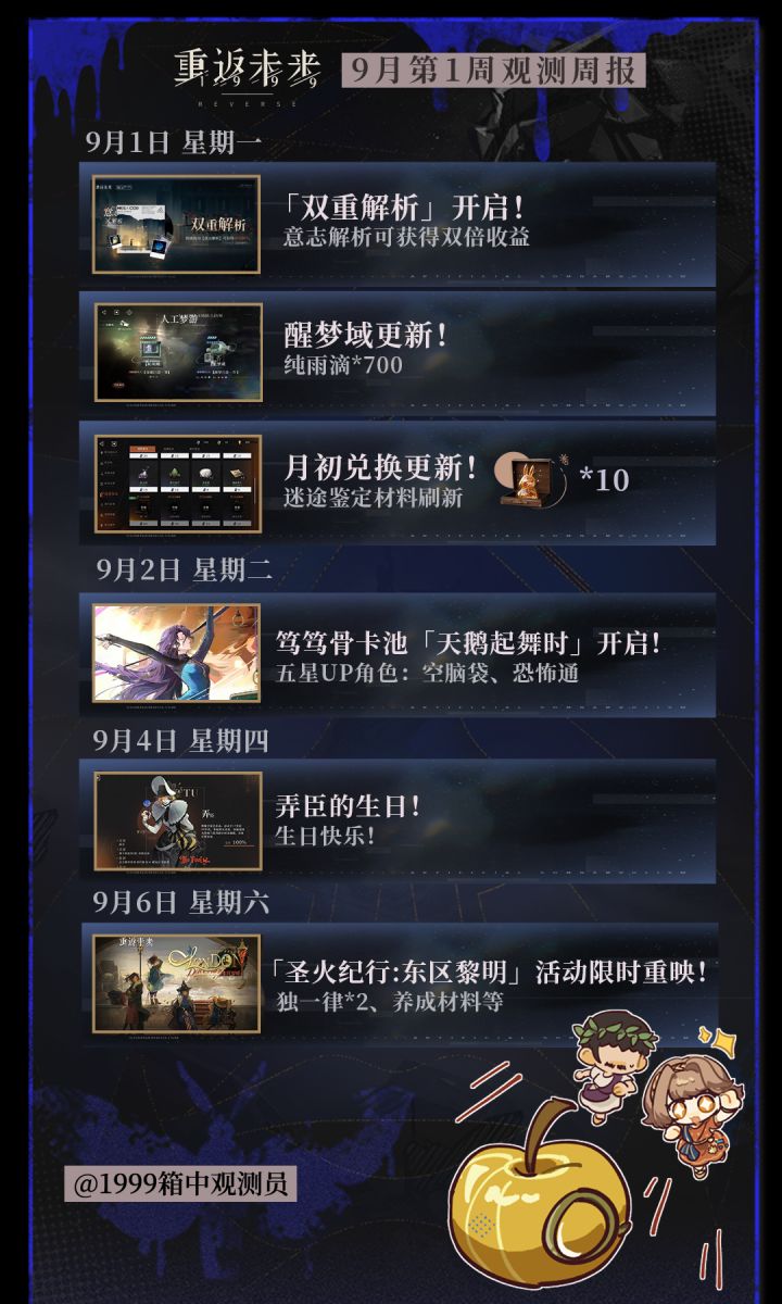 任何时间,任何地点,超级观测员,认真办周报!本周重返未来1999的活动提醒来了~司辰宝宝们记得点赞收藏,不要错过活动上新噢! ⭐周一⭐1.「双重解析」开启!2.醒梦域更新!3.月初兑换更新!⭐周二⭐笃笃骨卡池「天鹅起舞时」开启! ⭐周四⭐弄臣的生日 ⭐周六⭐「圣火纪行:东区黎明」活动限时重映! 我是带来最前线播报的观测员,内容制作不易,求司辰们点点关注~追更不迷路!