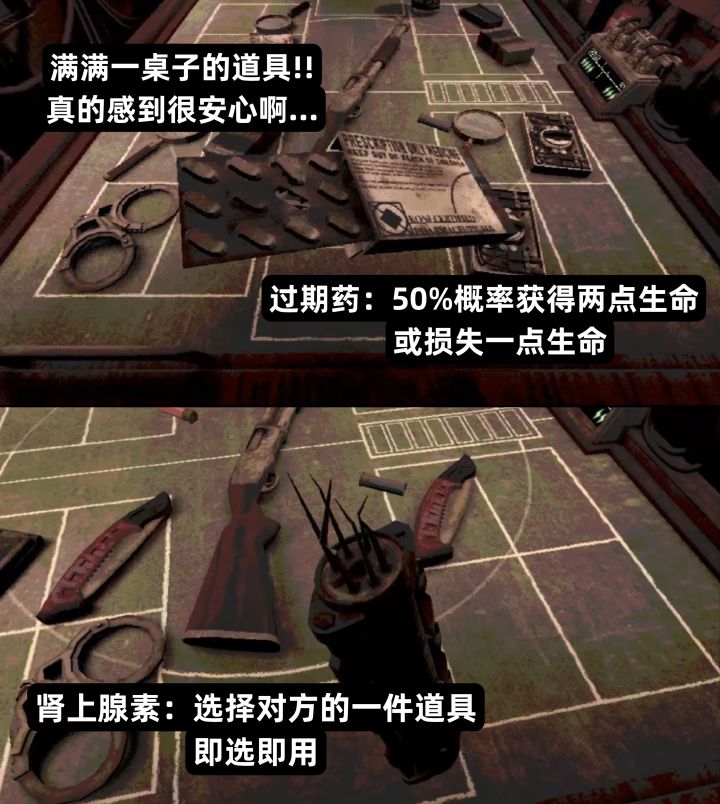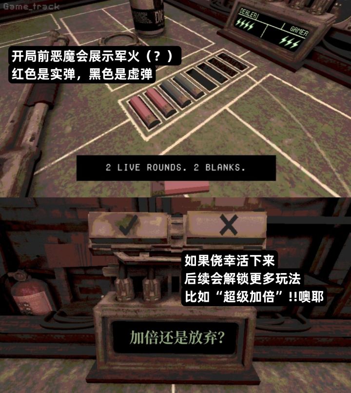 - 游戏玩法:核心玩法基于俄罗斯轮盘赌,使用12号口径霰弹枪而非传统左轮手枪。每轮开始,恶魔会展示并随机装填一定数量的实弹(红色)和空弹(灰色),玩家需猜测下一发子弹情况,选择向自己或对方开枪。若向自己开枪为空弹,对方跳过一回合;为实弹则自己减少一点生命值。向对方开枪命中则对方失去生命值,未命中则自己跳过一回合。- 道具系统:游戏中有多种道具,如放大镜可查看子弹状态,手铐能限制对方行动,香烟