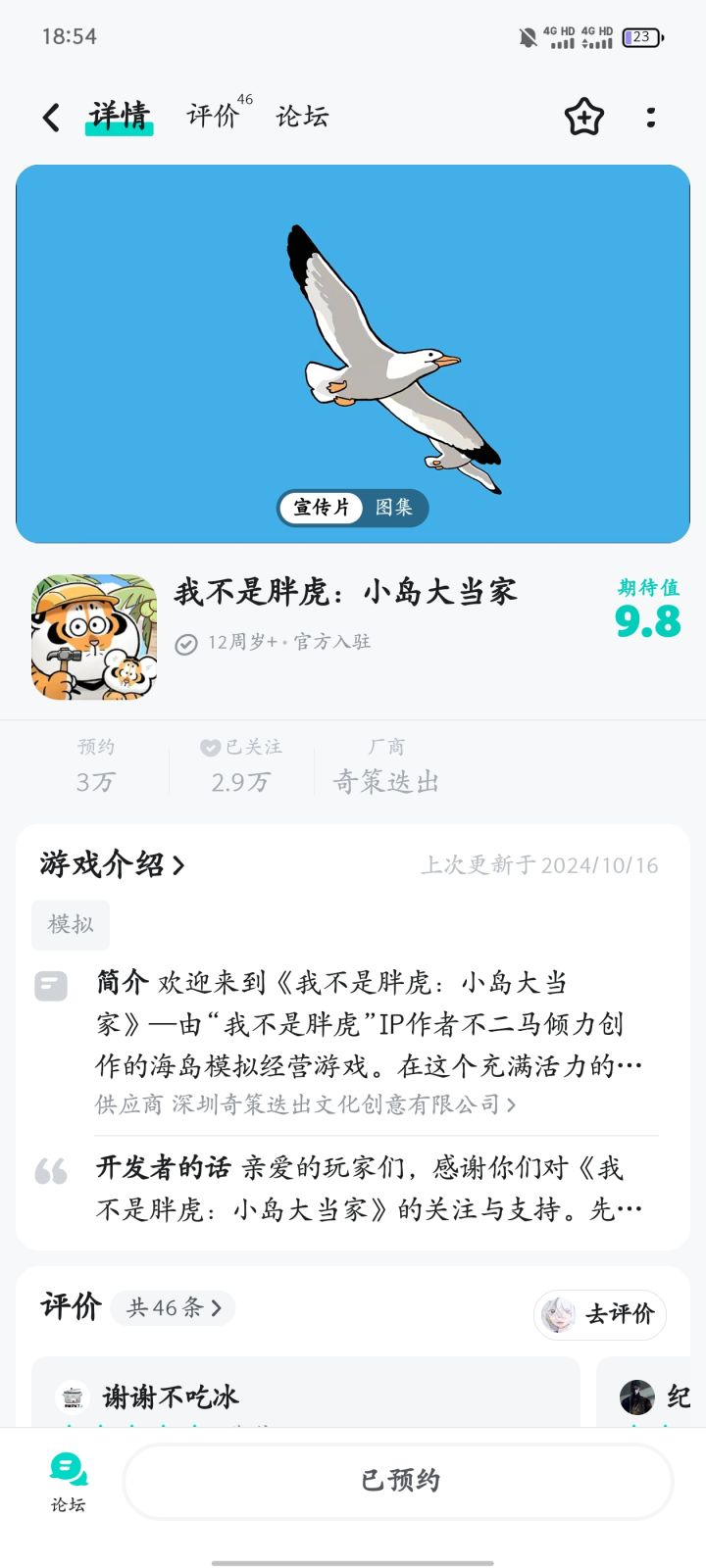 🌸游戏名:我不是胖虎: 小岛大当家🌸游戏类型:模拟经营/治愈/休闲 🌸游戏状态:预约中 ✨✨✨✨✨✨ 🌼俺是虎大,或许你不知道俺的名字,但是你一定知道俺的好哥们的名字熊大!🌼因为某些原因,俺就离开了森林,来到了这个小岛,这里没人砍树,而俺虎大就是这里的大当家!🌼在这个充满活力的小岛上,你将与俺虎大一起,帮助海岛上的动物们共同建设和经营,打造属于我们的梦想岛屿。