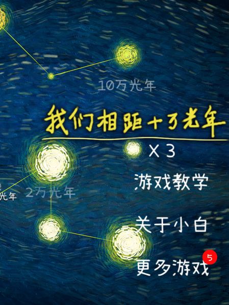 世界上最遥远的距离是什么?是她就站在我面前,而我却不敢说出那句“我喜欢你”。暗恋是苦涩的,但这掩饰不了它像星空般美丽的事实。我们每个人或多或少都有过暗恋的经历,今天为大家带来的就是一款以暗恋为题材的唯美小游戏。🎮游戏名:我们相距十万光年✅游戏平台:Taptap🕹️游戏玩法:游戏一开始,光线就在环绕星星转动。点击屏幕,光线会脱离星星并沿着切线方向运动,它的能量开始损耗。在能量耗尽前,光线如果被