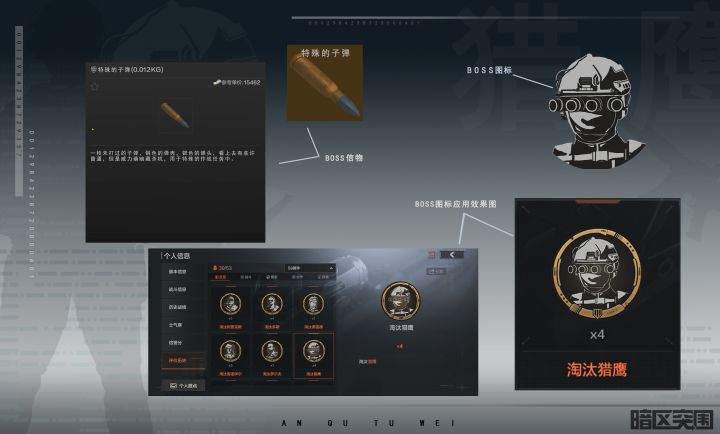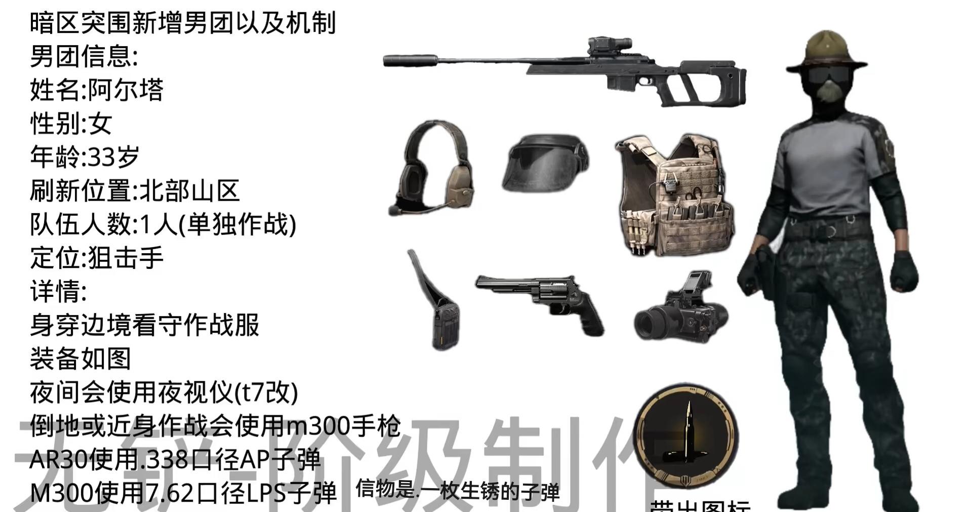 首领:满改T03配带5.8×42毫米的DVC12子弹,穿戴926夜枭胸挂和KN复合防弹衣,头戴03重型战术头盔+DK8军用防弹面罩或斯巴达C重装弹挂甲,头戴03重型战术头盔+DK8军用防弹面罩;身上是926野战背包或无背包;背包中会刷出红卡以及一些紫色钥匙#我在暗区做策划