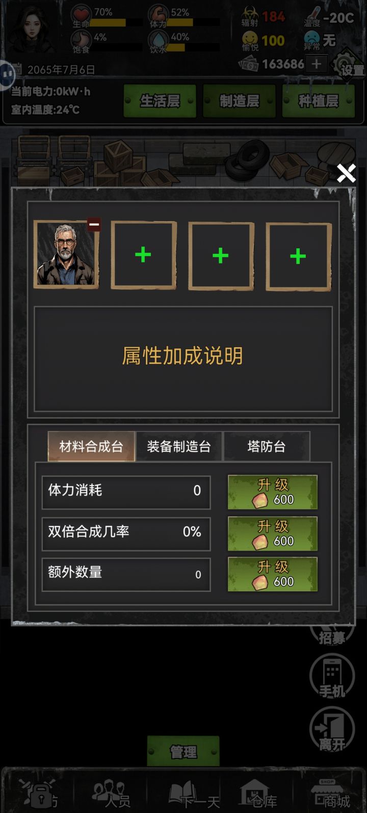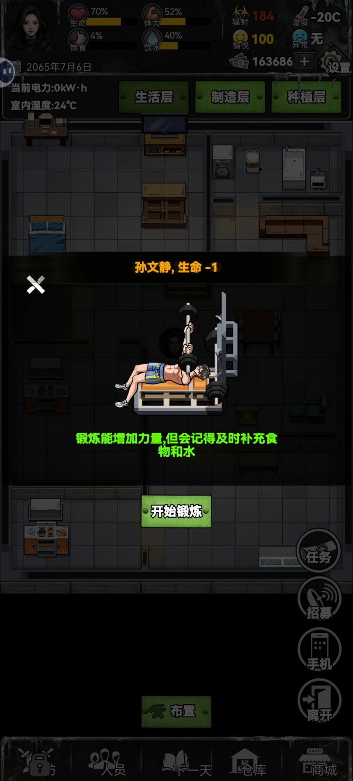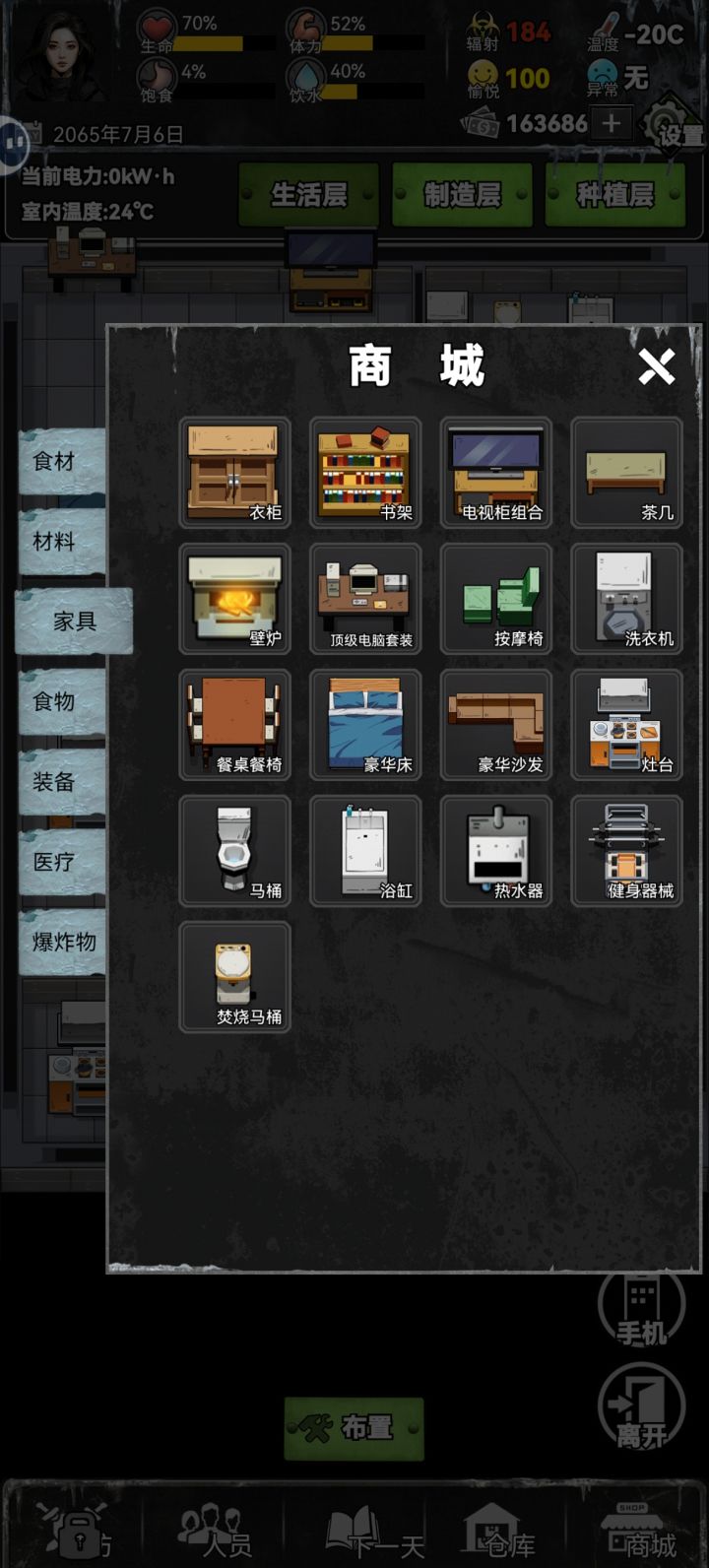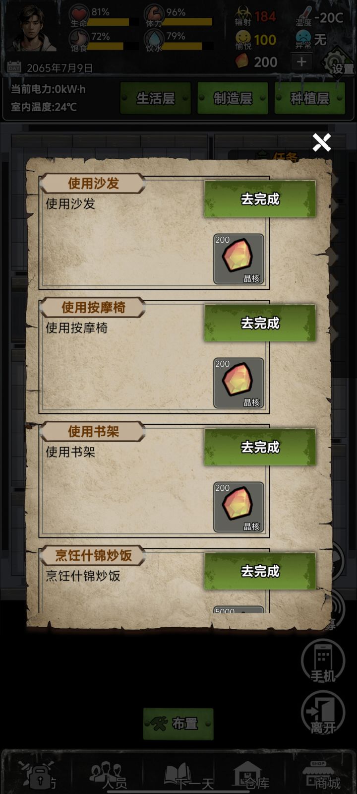 游戏内票票可以任你自由购买物资!虽然花钱很快但还是喜欢这个设定!家具可以自由点击探索!这个也有意思!另外要不是能看广子领钱真要活不下去了哈哈哈,前期建议疯狂刷广告攒物资!我走的剧情:租别墅,贷款,最贵防护建筑,手机联系的朋友都拒了(就算有什么美好剧情在等我也不要,就怕末世久了人心叵测)第一周1,种植区加工区希望能加个图标,能看到种植制作的是什么东西