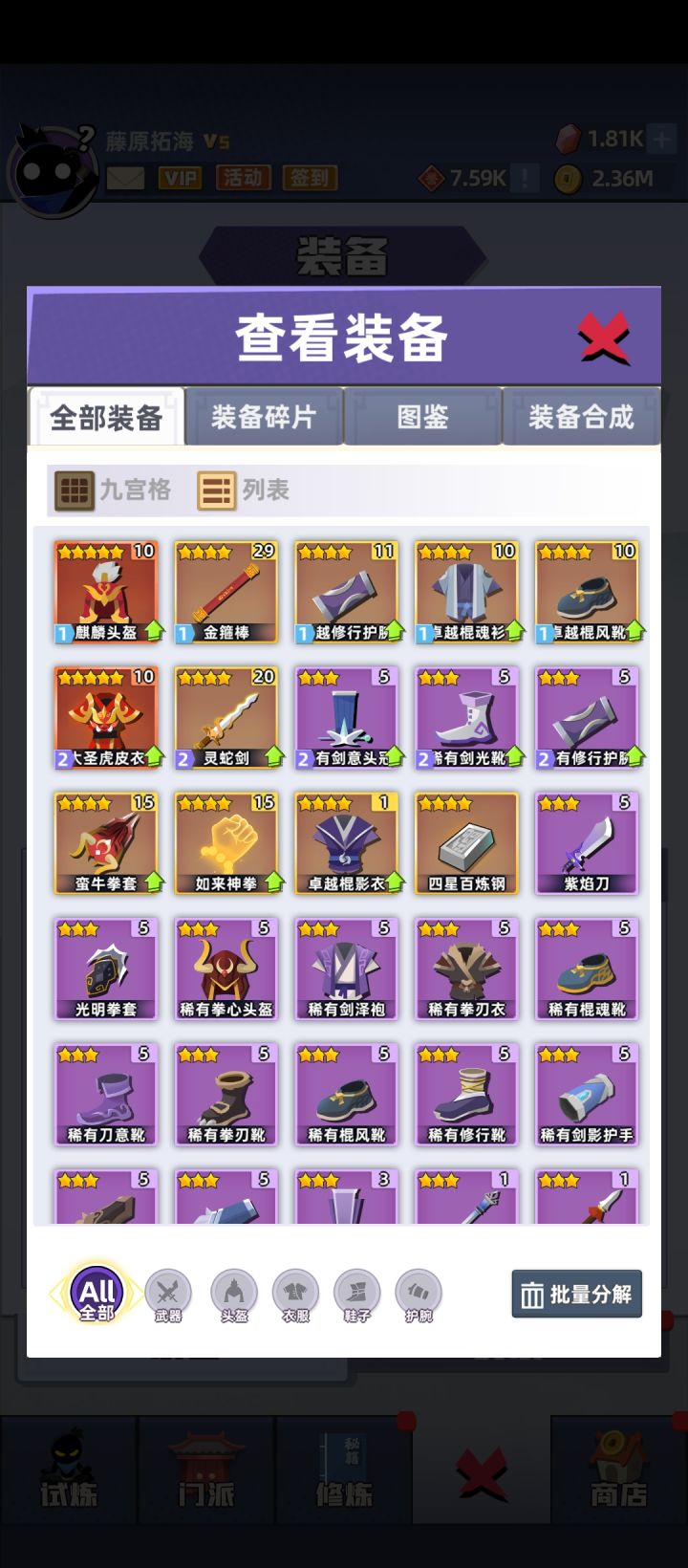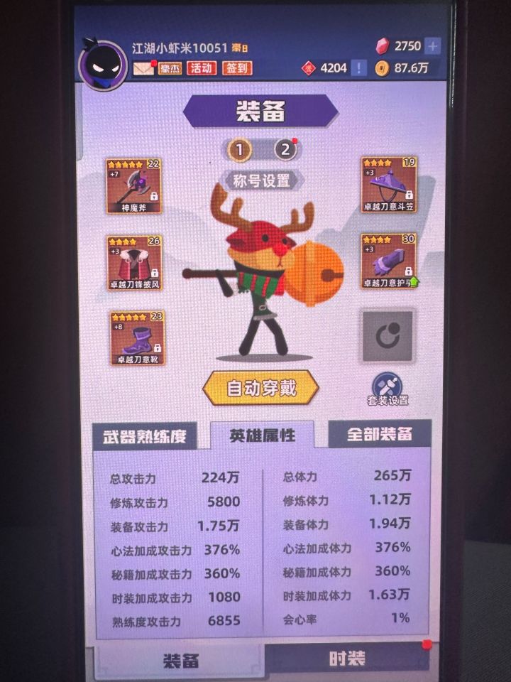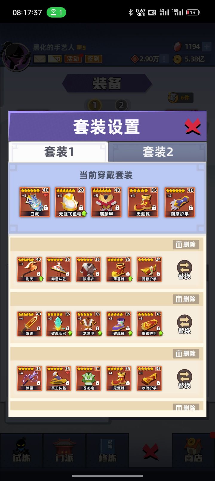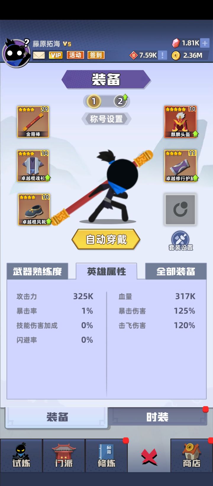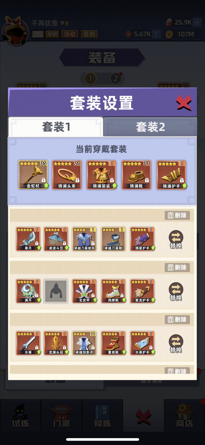 微氪,更新后给了不少5星,努力的在养,宝石还有不少。遗憾的是4星的棍魂套刚刚成型,浪费了,都基本升级到5星了,现在有了5星也只能吃灰了。目前还卡在5210,原因是蛇棍打不着上面两只小怪。总是差一点点。这样看来蛇棍始终还是差点,想请各位大侠讨论一下,上限高的套装。满月套?刀霜套?两仪?方天画戟?(这套我都还真齐了只是没培养)欢迎畅所欲言。