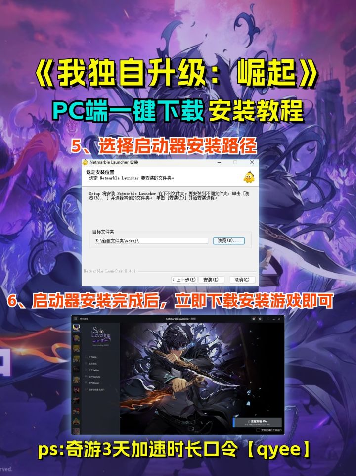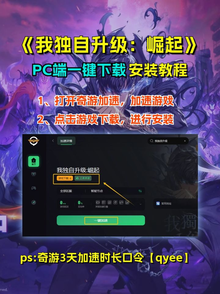 我独自升级将于5月开启周年版本!目前也是开启了周年预约活动!参与预约周年庆时即可获得丰厚奖励!本期内容给大家带来游戏下载教程以及周年预约教程!预约奖励如下:安卓下载教程:第一步:TapTap内搜索并下载安装奇游手游加速器第二步:在奇游内搜索【我独自升级:崛起】即可下载游戏。 记得找到游戏下方【口令入口】界面,输入兑换码【solo2】领取会员时长。 第三步:下载时推荐奇游空间安装,当