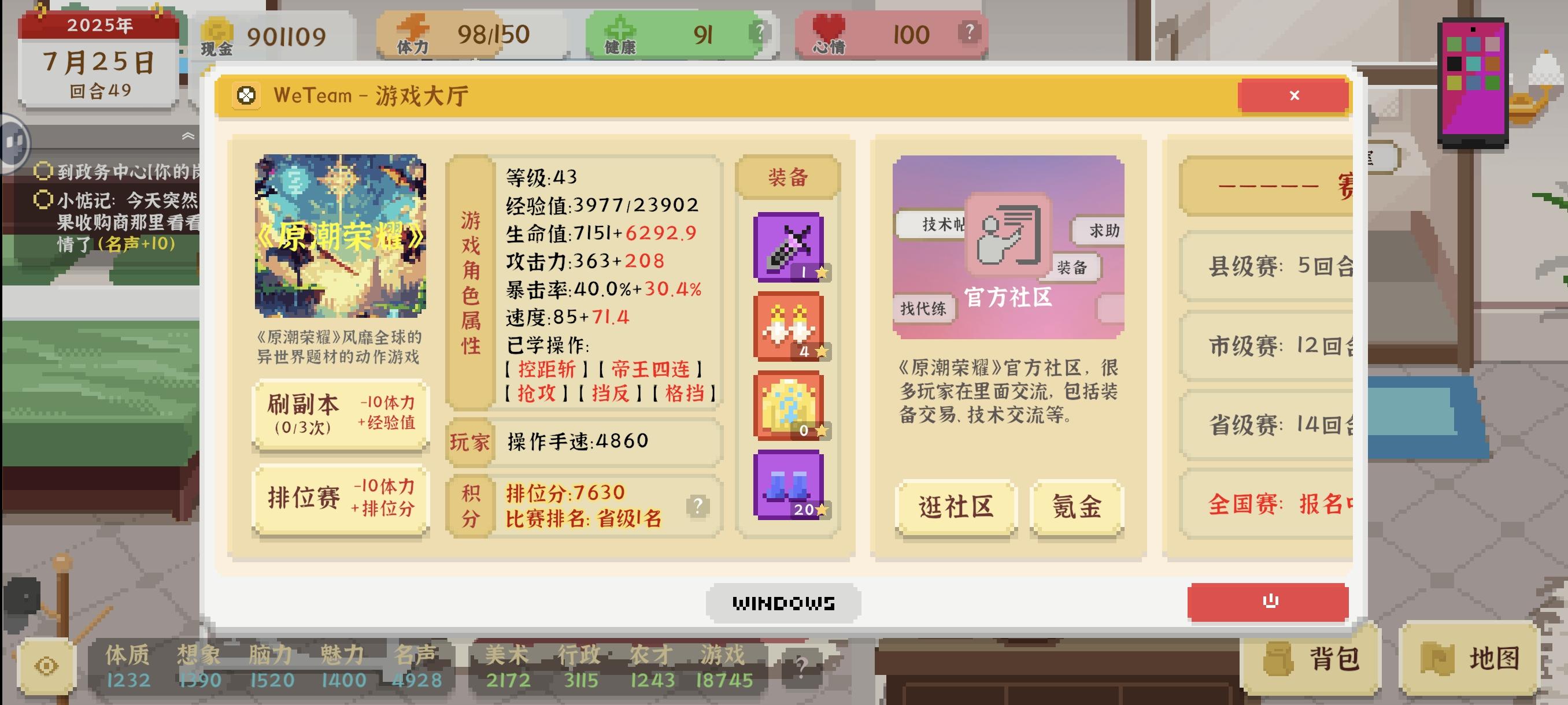 游戏线的游戏数值比较麻烦,一天只有三次副本机会,排位赛的敌人打完一个后下一个战力涨幅比较高,并且想要涨战力前期只能打副本打排位。 线下比赛需要在游戏中心看还有几回合可报名,并且可报名时需要在每日头条里面点进去报名 参加县级线下赛后第一名奖励2000现金,解锁(逛游戏社区)(游戏氪金)(通天代) (逛游戏社区)内可观摩加手速,参加组队副本,购买荣耀水晶(游戏氪金里面抽奖用的) (游戏氪金)顾名思义氪