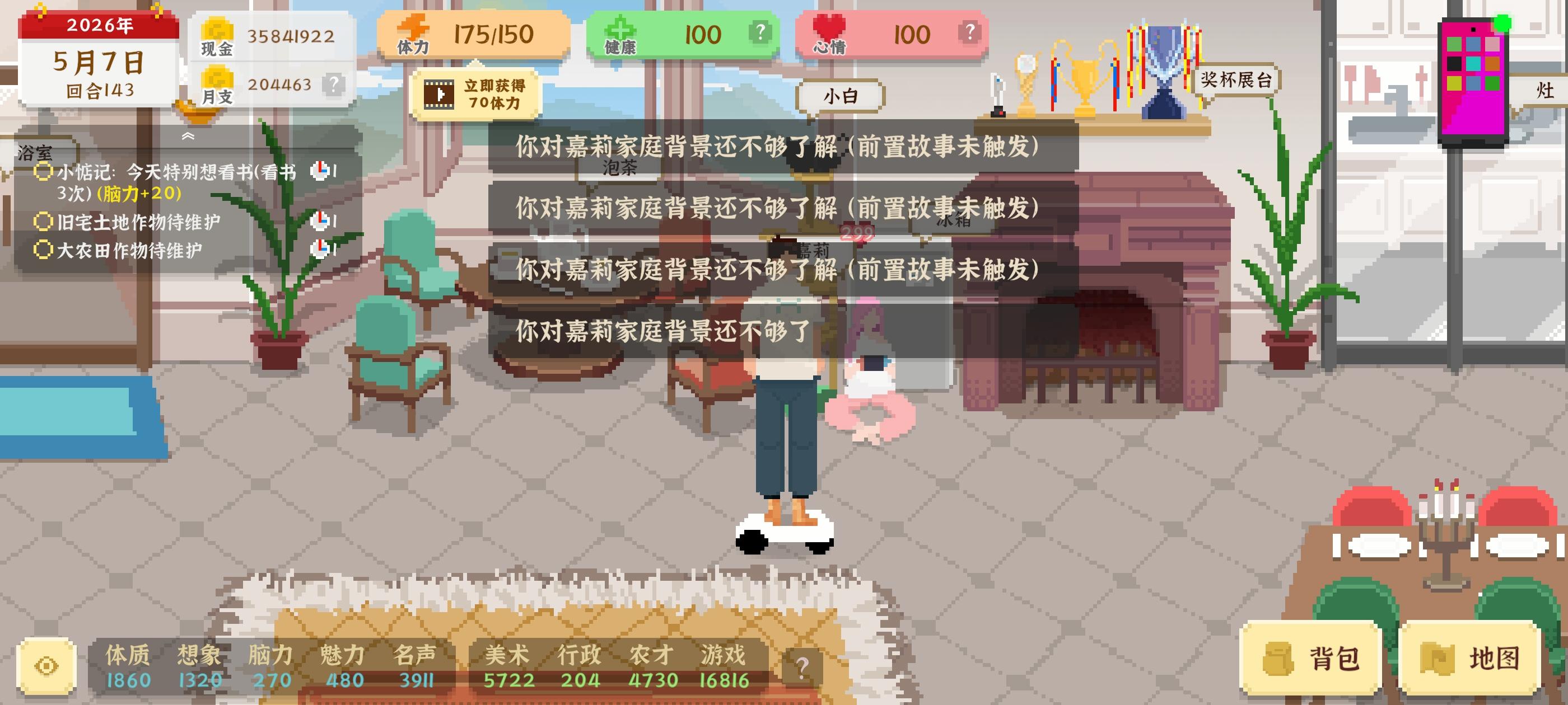 两天断断续续玩了会,现在结局了,有感而发。走的电竞线,开局就打游戏,网吧认识嘉莉,主要我是为了挣钱,感情线就没怎么管。第一天玩,主要就是打游戏,打排位,接单代打。打的很头疼,还没什么钱。第二天玩,直接开直播,每天开直播刷副本,没体力就吃外卖,最后直播起飞,赚了第一桶金十万多。接下来就是开游戏公司,总结下来就是选择三星直播数据高的员工,打赏给他刷热度,叶飞来当主管就不用管了,八个牛马使劲挣钱