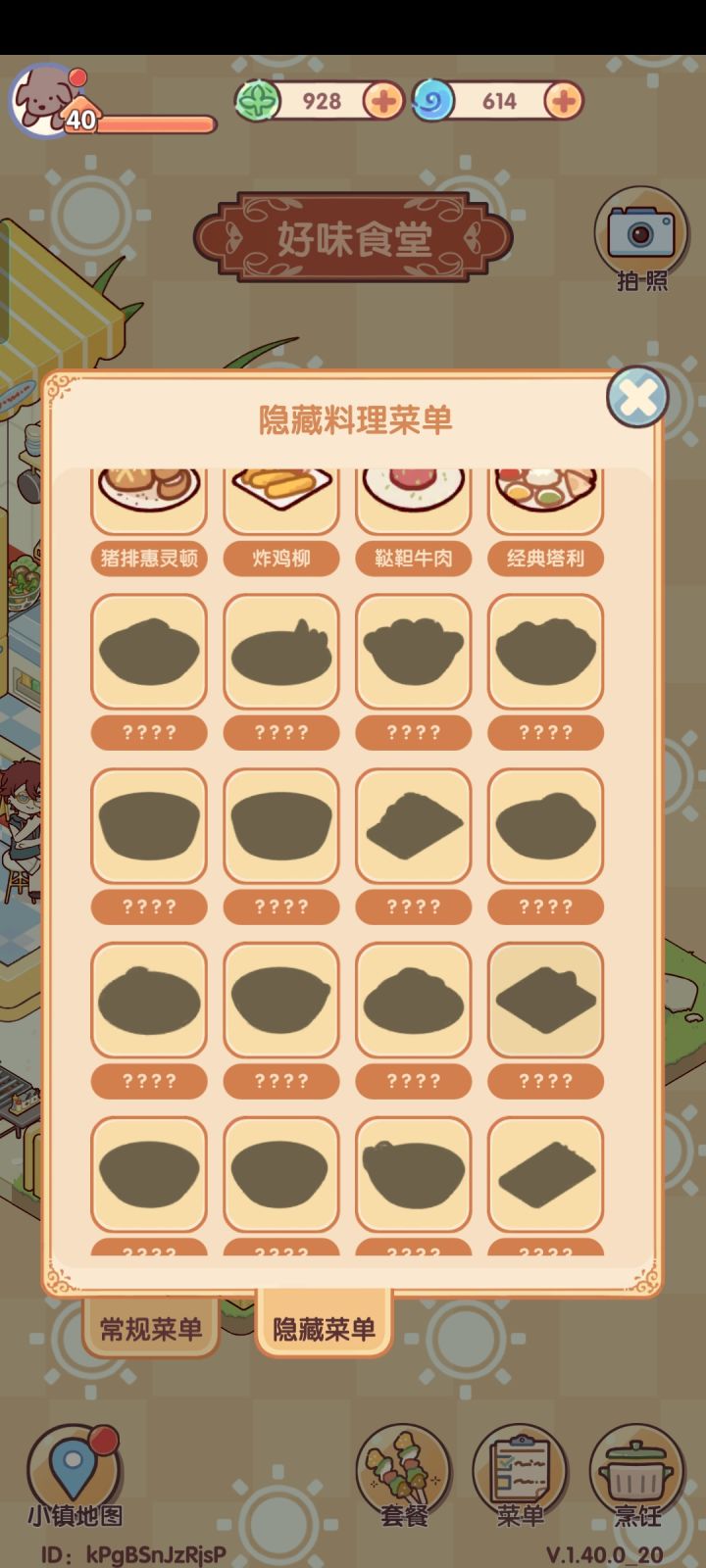 #我的休闲时光 也有更新前的四个隐藏菜单。一级菜单:土豆=黄金薯条番茄+鸡蛋=番茄蛋花汤番茄+牛腩=番茄牛腩土豆+牛腩=咖喱土豆牛腩饭二级菜单:小米辣+鸡腿肉=当红辣子鸡排骨=糖醋排骨胡萝卜+排骨=萝卜煨排骨土豆+鸡蛋+胡萝卜=什锦土豆饼鸡腿肉=照烧鸡肉饭土豆+番茄+胡萝卜+排骨=排骨闷饭土豆+牛腩+胡萝卜+小米椒=红烧牛腩胡萝卜=清炒胡萝卜片三级菜单:鸡蛋+茄子