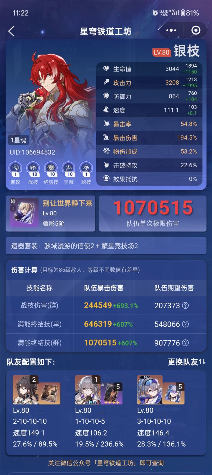 我没带治疗才能打出这么高的伤害,带治疗的话伤害得降几十万,打 黄金与机械直接杀疯了,只要祝福选的好,几千万几千万的打。#我的崩坏:星穹铁道数据#游戏安利#游戏推荐#国产游戏#二次元#崩坏星穹铁道