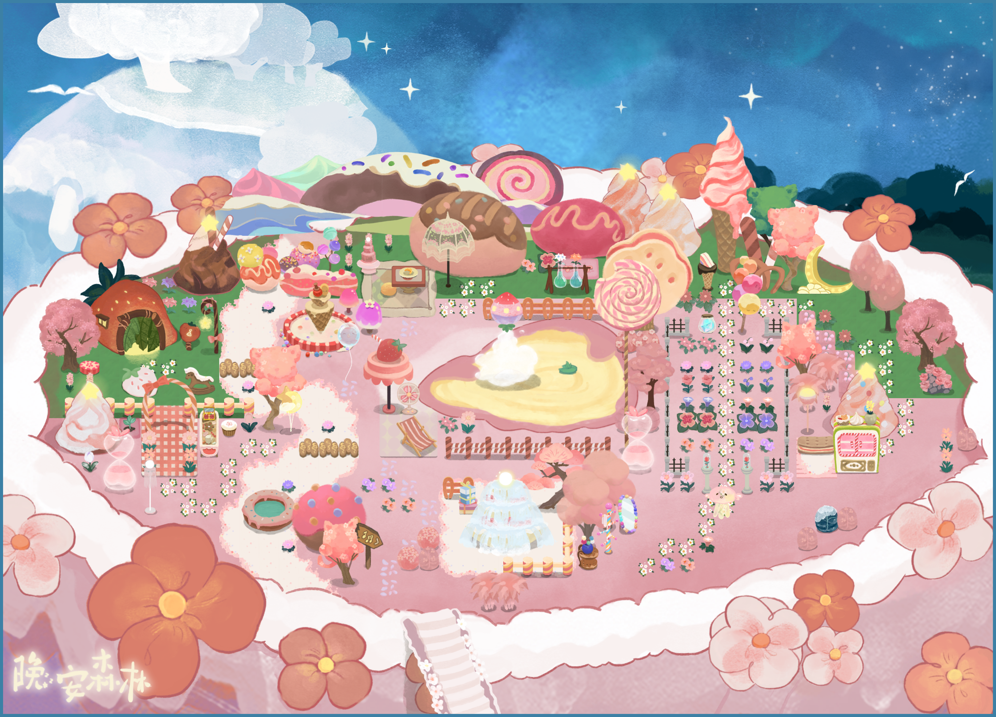蛋糕山暂时完工啦,参考了官图,花费了巨多的面粉,地板还是没铺完,不打算再铺了,太费肝了,之后可能会再补点棒棒糖什么的小物件。可惜没抽到小火车,抽到的话打算把它放到奶油湖上方那片草地上。#晚安森林 #晚安森林的慢生活 #向全世界安利晚安森林 #晚安森林布景 #我的晚安森林