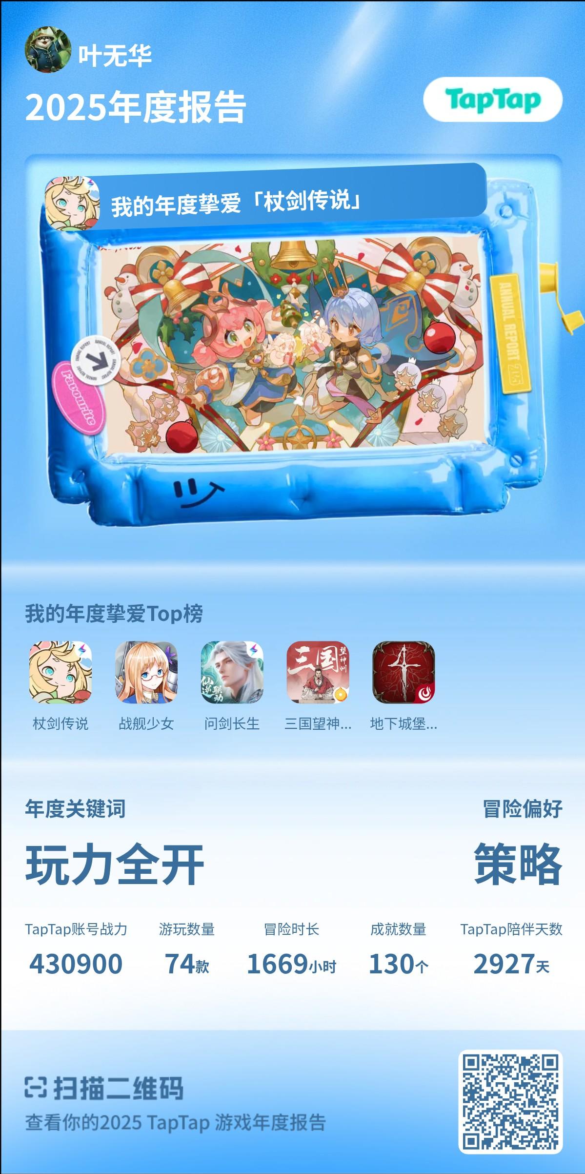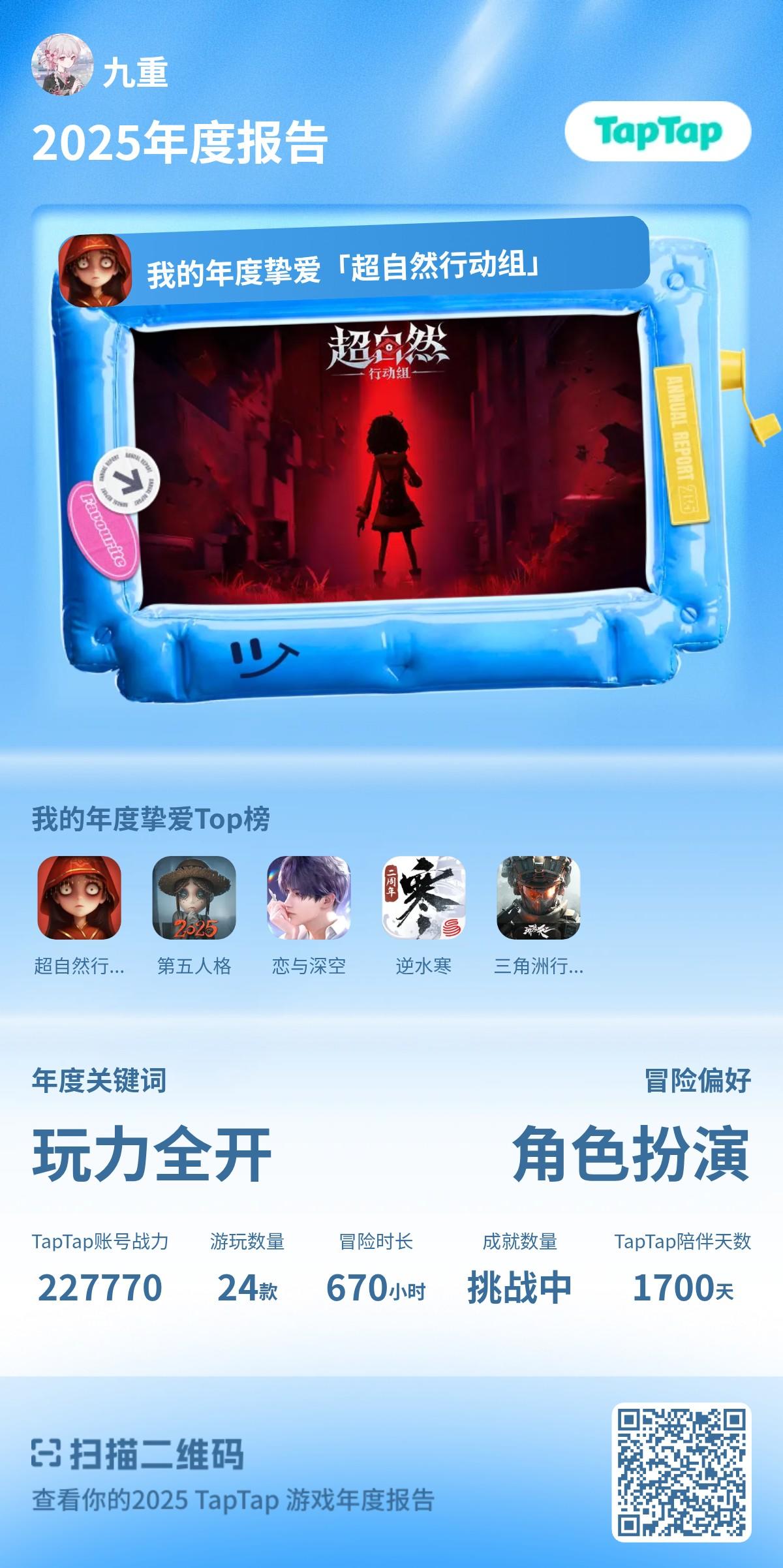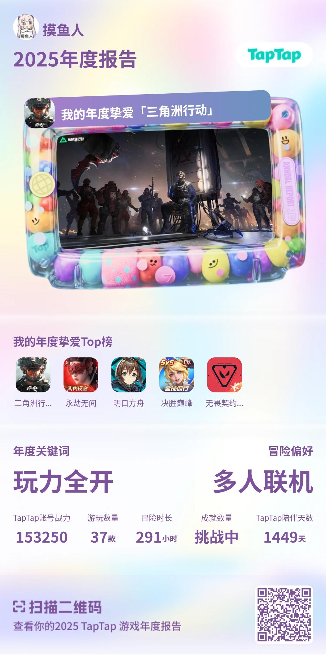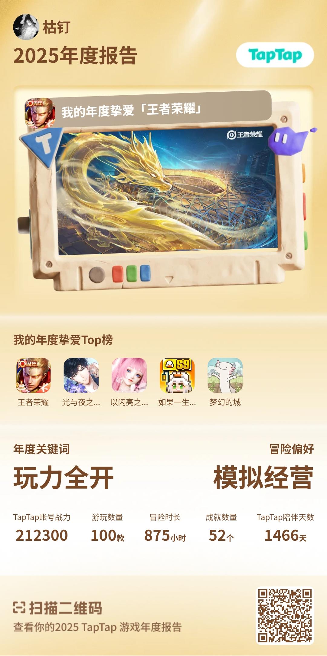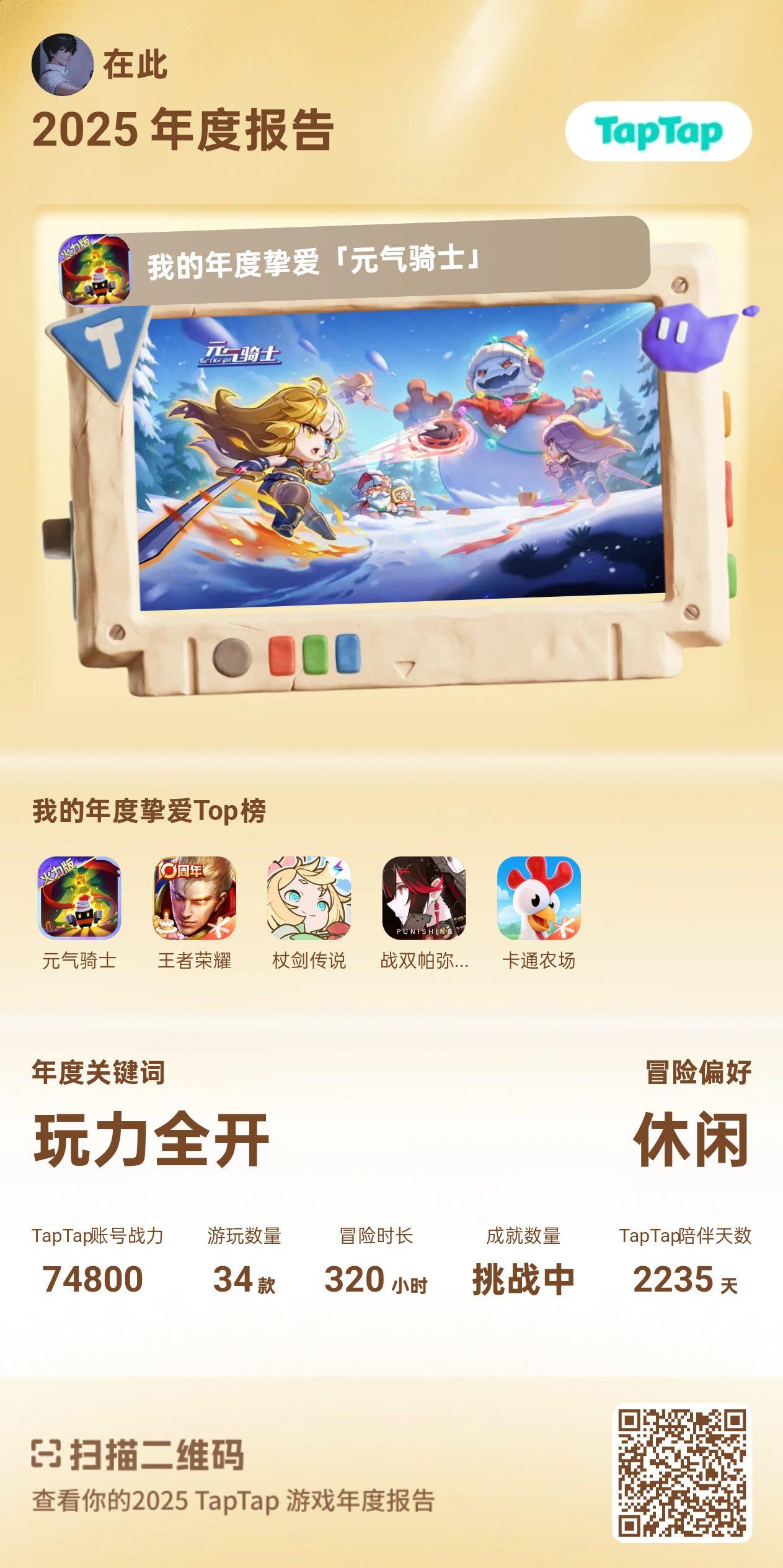 ✨ 点击解锁你的专属游戏报告「」致又相伴一年的 Tapper:当你在探索宝藏新作时,我们记下了你的期待;当你挑战关卡、突破自我时,我们见证了你的成就;当你认真写下评价、分享感想时,我们收藏了你的心声。又是一年,你的专属「2025TapTap年度游戏报告」已加载完毕!这不仅是一份报告,更是属于你的冒险存档——记录过去这一年,你作为玩家、作为探索者、作为同行人,那些闪闪发光的冒险