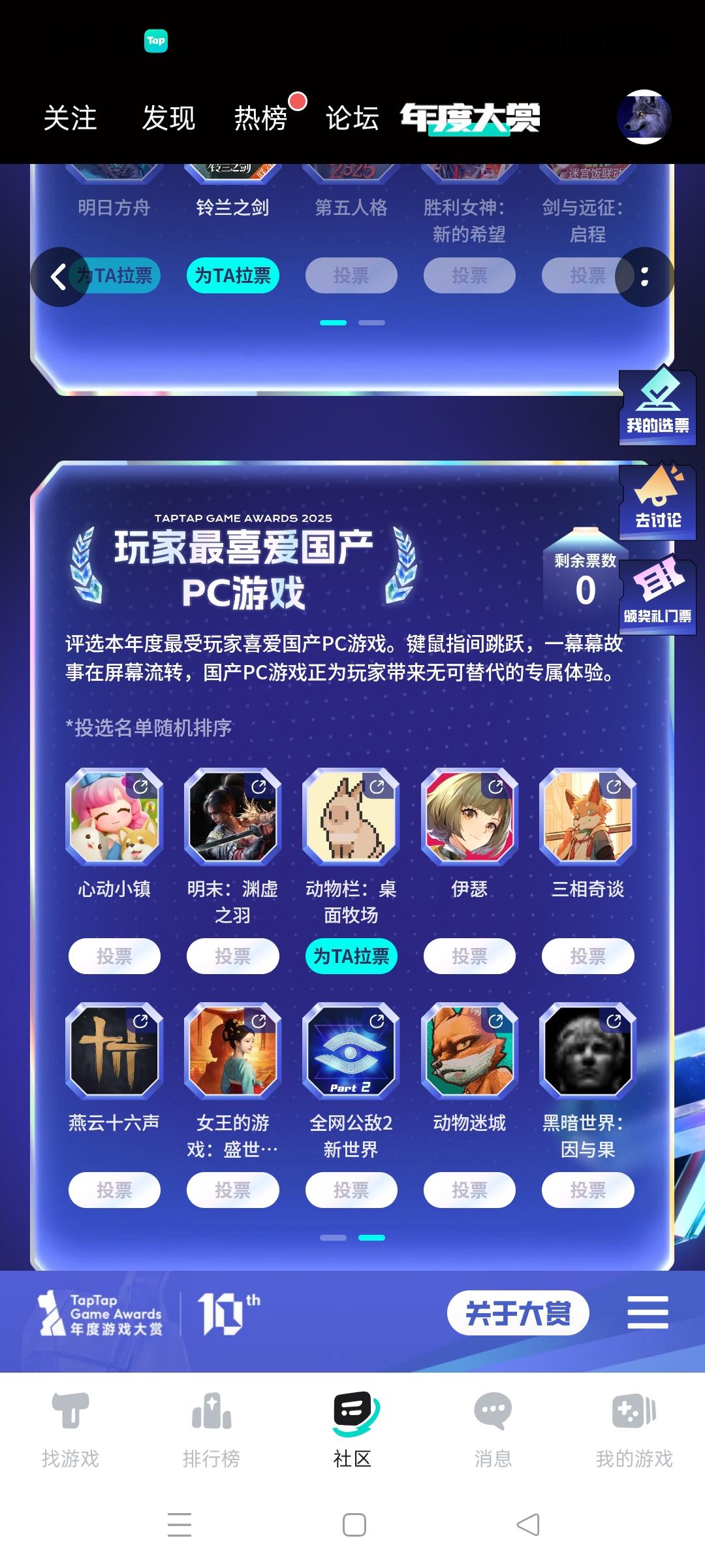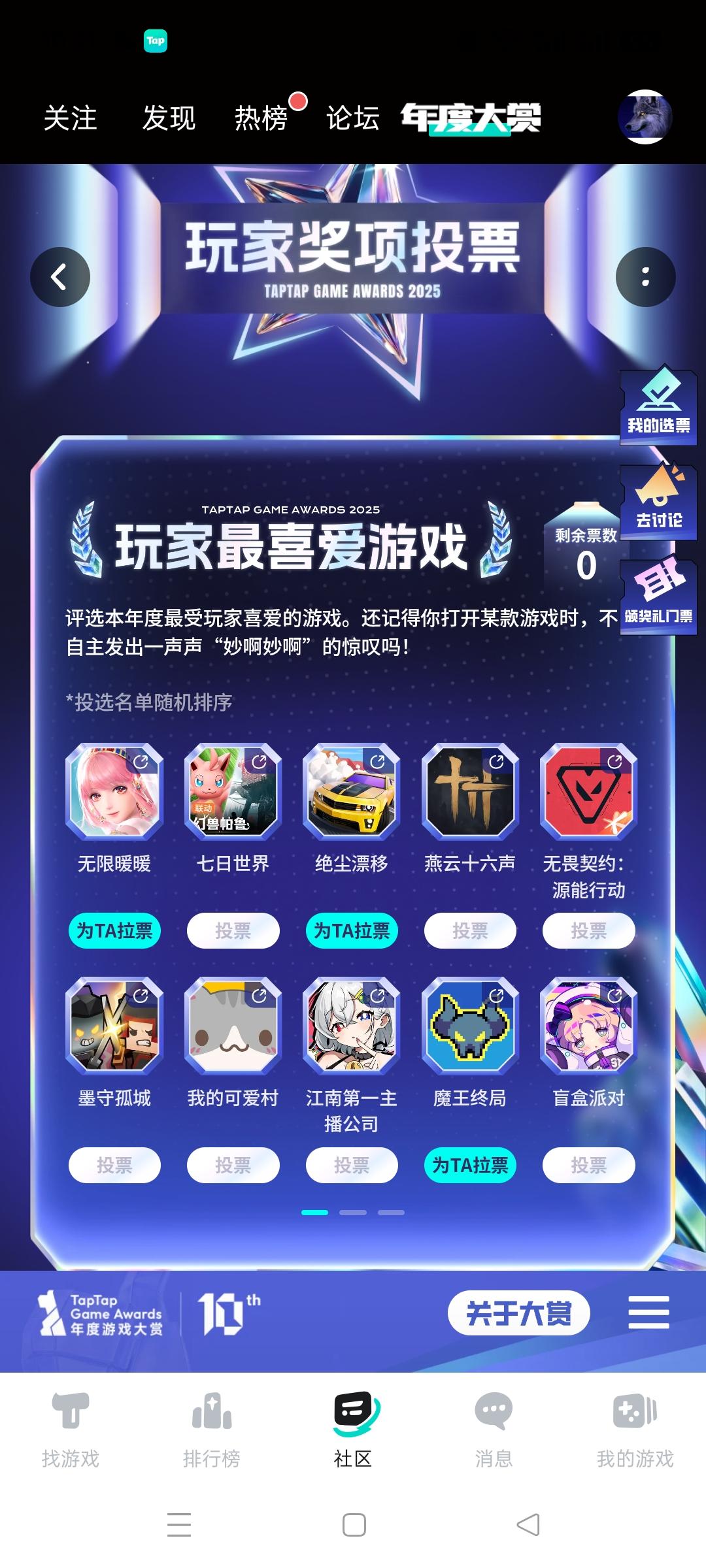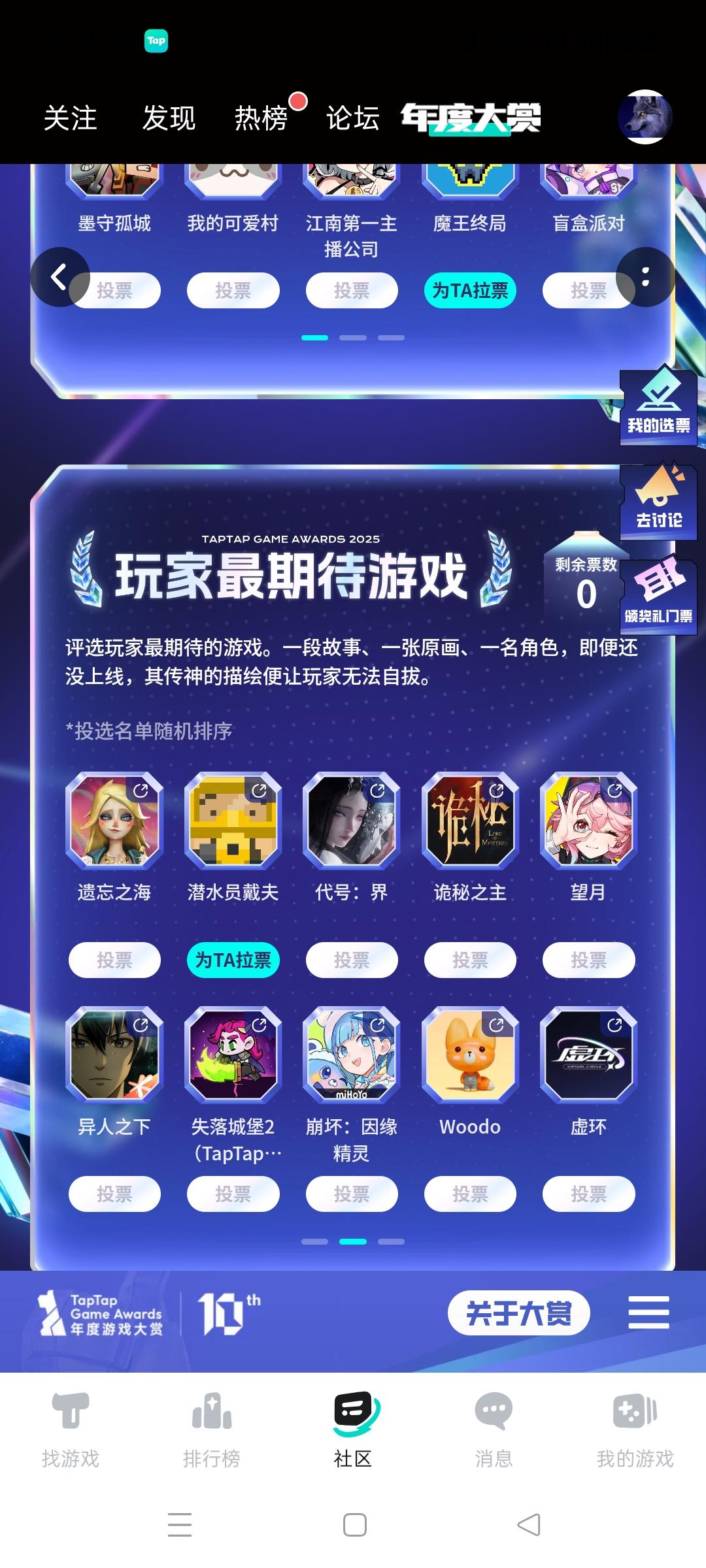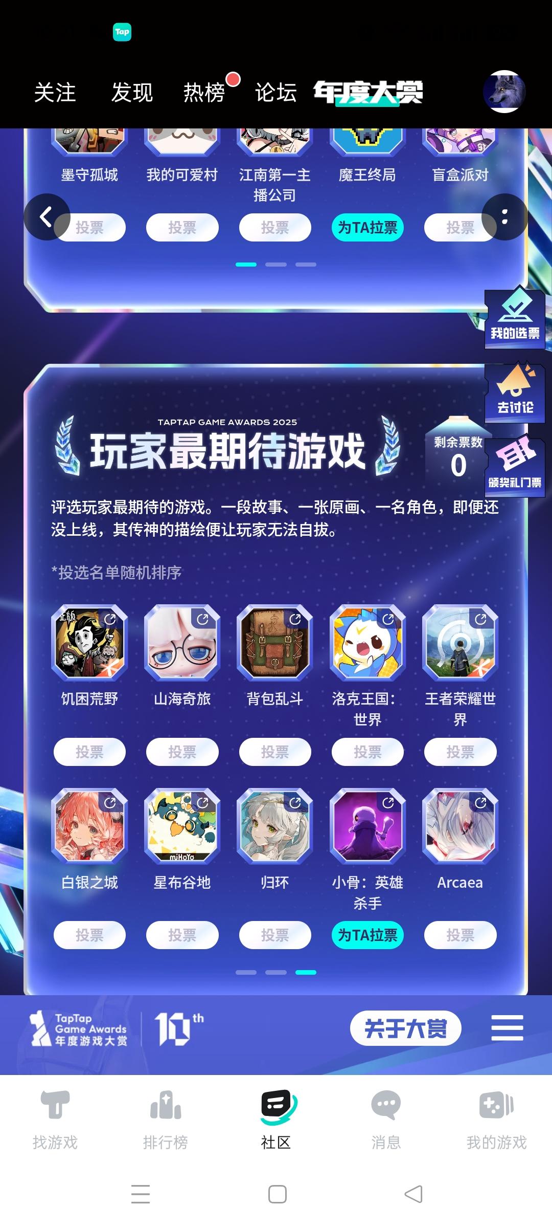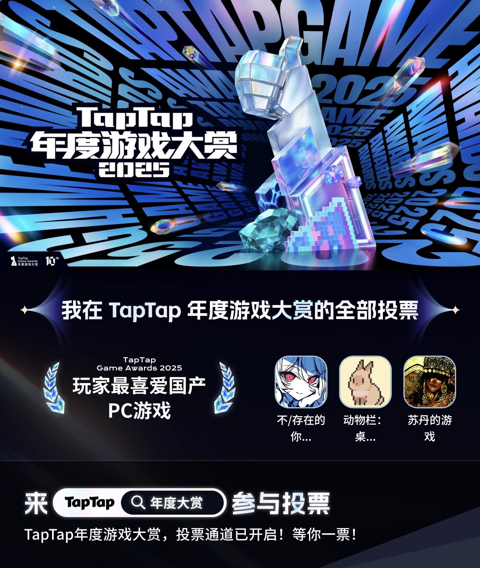 獭獭邀请你加入 #我的2025游戏大赏 !来评论区猜猜谁会拿下年度大赏「最佳游戏」奖项,同时晒出你的游戏大赏投票结果与理由,与万千玩家一起回顾 2025 的高光游戏时刻吧!✨ 你可以分享:● 评论区猜一猜:一起来评论区猜猜 2025 TapTap年度大赏中「最佳游戏」奖项会是谁?● 晒出投票结果:带话题#我的2025游戏大赏 分享你的「2025 TapTap 年度游戏大赏」投票结果与原因,也