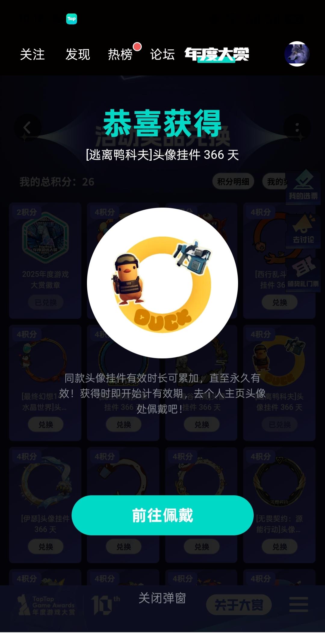 #我的2025游戏大赏 大家记得每天参与活动兑换徽章和头像框哦,和往年一样,今年依然有一个徽章可以兑换,而且造型很好看,唯一可惜的是没有永久头像框了,都是366天的,我也是赶紧兑换了永久的徽章,第二个兑换了最喜欢的鸭科夫头像框,可惜没找到无限机兵和动物栏的头像框,所以第三个换了一个三国的这个龙形的头像框。好在头像框过期了只是不能佩戴,不过依然能看到的,喜欢的小伙伴们记得兑换哦活动链接如下快来