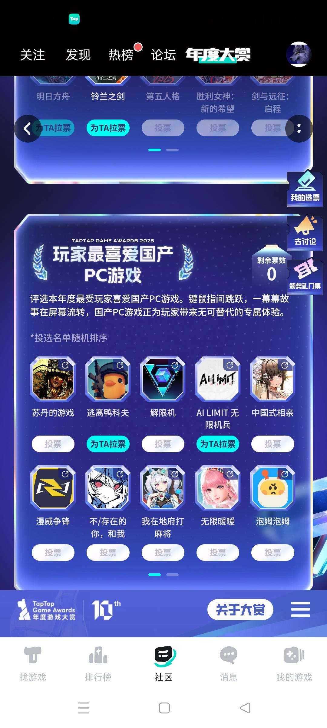 #我的2025游戏大赏 投票结果如图所示这次最爱的pc游戏有三个投票,最喜欢的还是逃离鸭科夫了,玩起来真的好上头,而且q版造型和各种玩梗也是特别有趣,之前玩的都是像素风的搜打撤,这次换成3dq版风格让人眼前一亮其次是无限机兵,这个主要是喜欢末世科幻风格还有第三人称动作游戏的设定,另外主角红色手臂的设定也是特别喜欢,还有各种造型酷炫的武器啥的最后动物栏也很喜欢,这也这个是我个人玩的第一个桌面