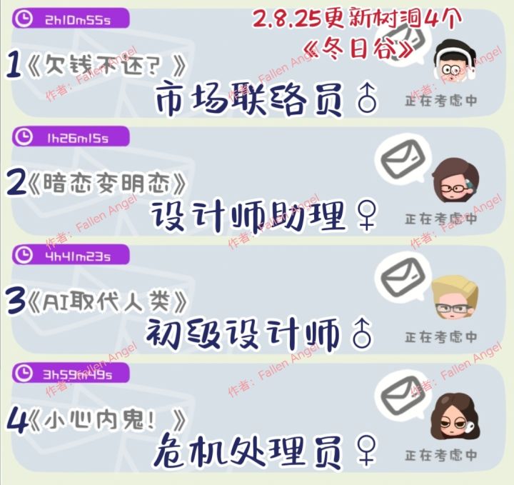 雪霁公寓又更新了,终于集齐了新树洞一定要选择指定的租客,还要区分性别♂男和♀女。树洞的触发时间为夜间0:00。每天只能触发3个树洞。小伙伴们,快来一起集齐树洞吧。#单机游戏 #发现好游戏 #攻略 #游戏安利 #游戏推荐 #游戏日常 #游戏讨论 #房东模拟器树洞 #房东模拟器