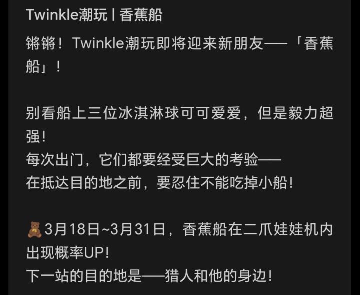 时间:3月18日一3月31日地点:二爪娃娃机概率UP也就是星期一,就是更新抓娃娃次数了。大家觉得这次娃娃如何,我有点看不明白,是三个娃娃一起还是分开#抓娃娃#娃娃更新