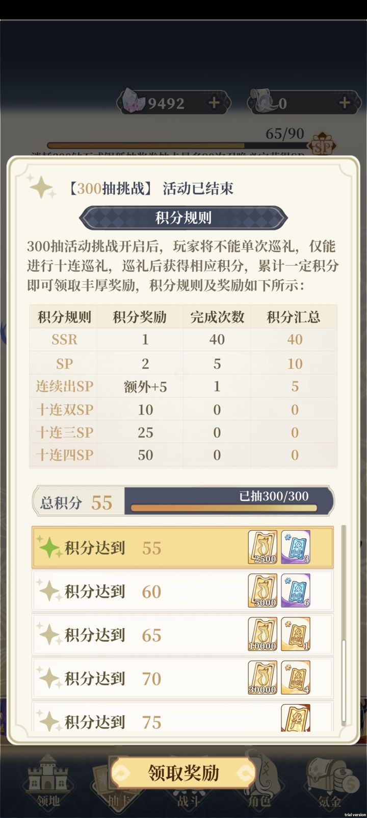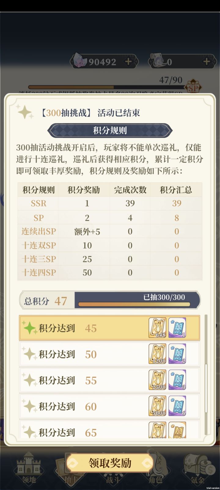 看广告凑到48.6W+钻,算平均一个广告800代金券(其实经常到不了)*1.35加成=1080代金券=10800钻,凑48.6W看了45次广告。一次300要2700*30=81000=8.1W,能抽6次300,给大家看看真实概率,6次积分分别是61,48,54,53,47,55,共获得6+1+2+2+1+3=15小非广告碎片。免广告要180碎片,大概重复180÷15=12次,预计看广告12*(45